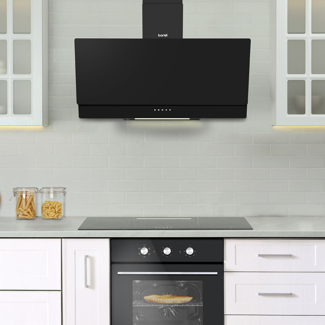 Baridi 90cm Angled Chimney Cooker Hood with Carbon Filters, LED Lamp, Black Glass - DH106