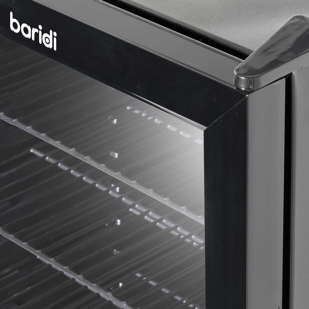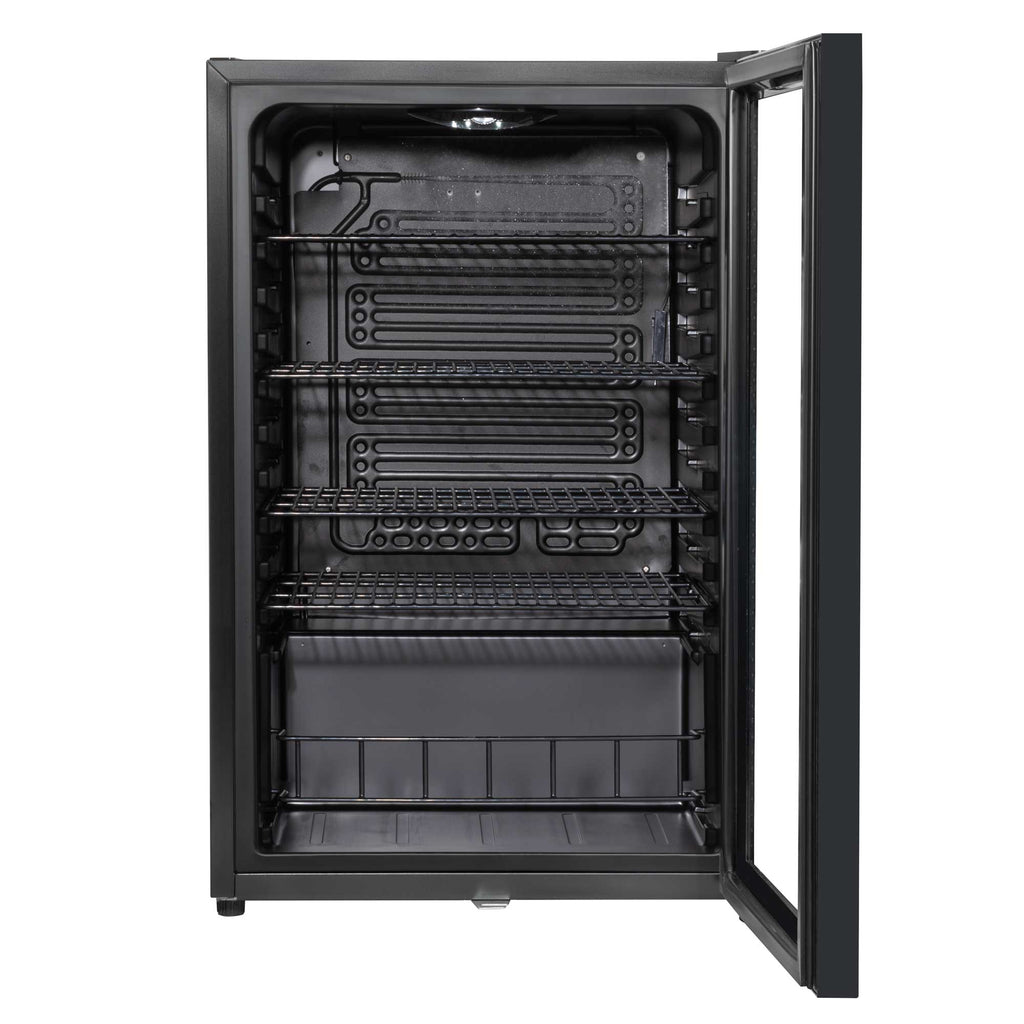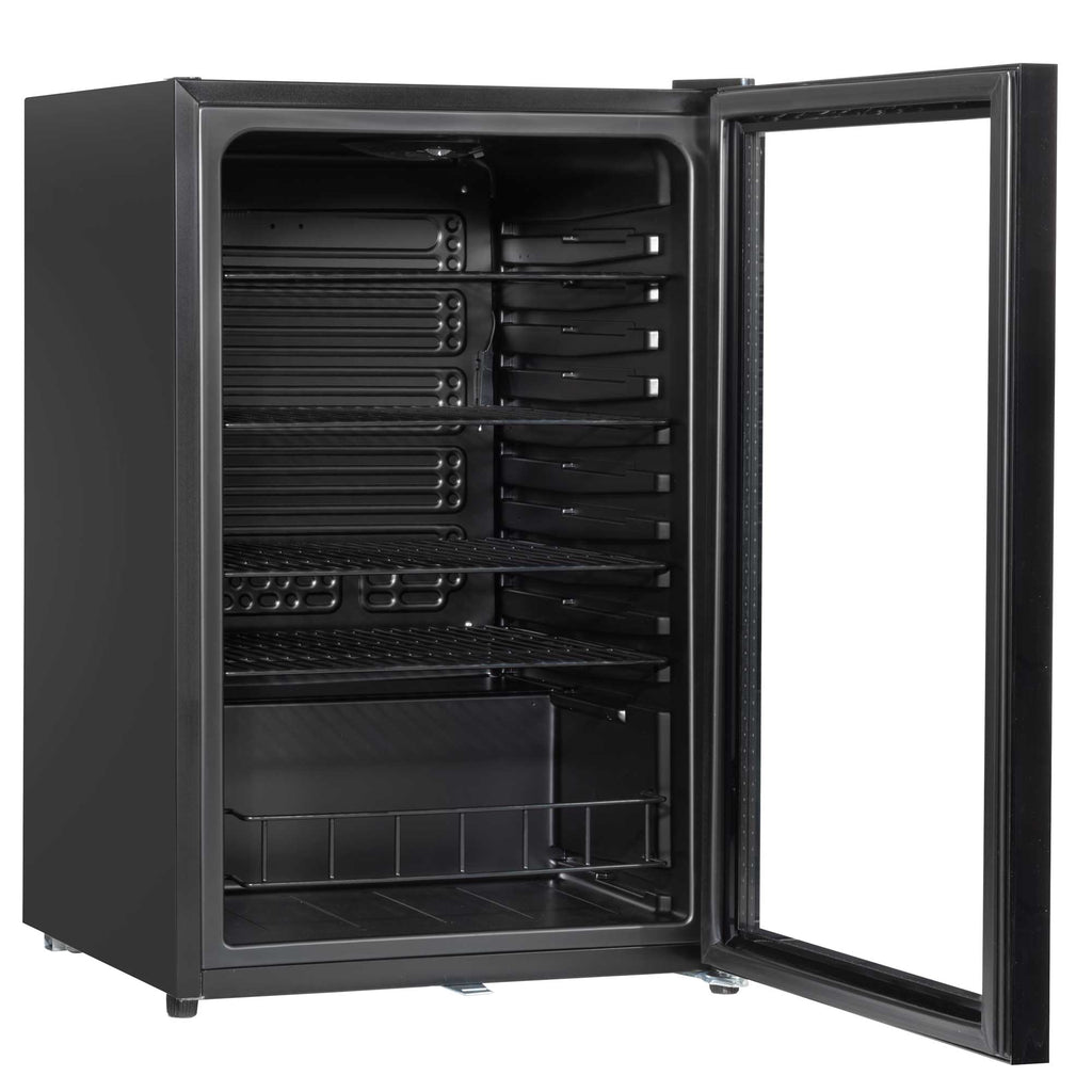 This drinks fridge offers a capacious 115-litre storage space, making it ideal for storing a wide range of beverages for personal use or small commercial settings. Its efficient compressor cooling system ensures rapid and consistent cooling, maintaining a steady temperature between 0 and 10°C, which is perfect for keeping your drinks at their best serving temperatures. The fridge includes a manual defrost feature that helps you easily manage frost buildup, preserving optimal cooling efficiency over time. With its sleek and modern design, the fridge features black wire shelves that not only provide a stylish look but also allow for excellent airflow to ensure even cooling throughout. An energy-efficient LED light inside enhances visibility, making it simple to find and access your drinks even in dimly lit environments. With dimensions of 54 cm by 54.8 cm by 84.5 cm, this fridge is compact enough to fit in various spaces while providing substantial storage capacity.