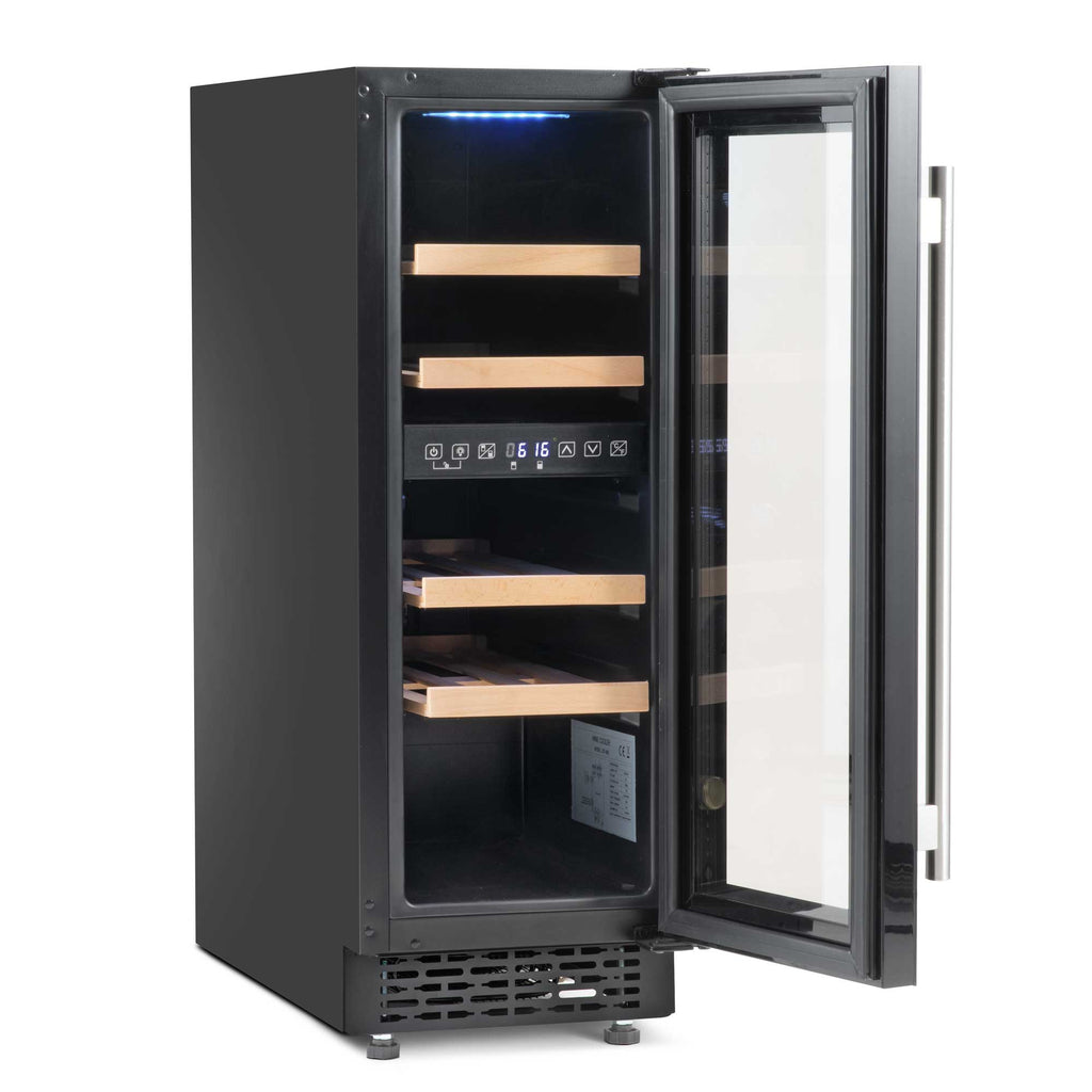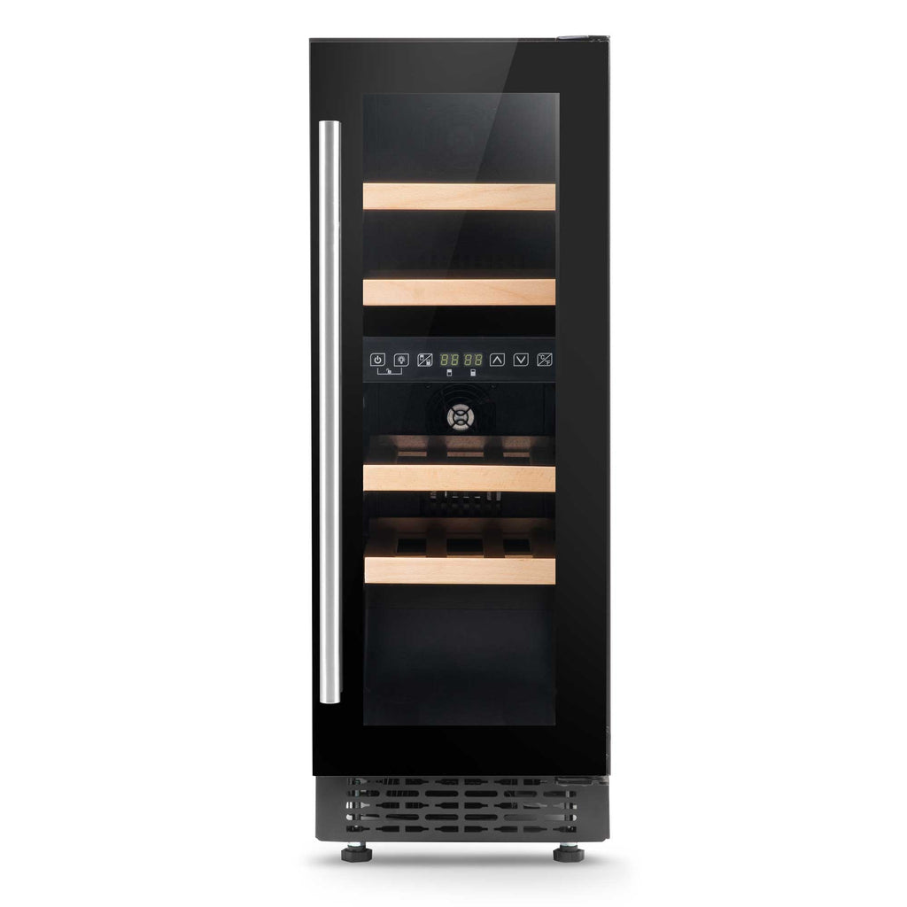 This slim fit wine cooler adds a stylish touch to your kitchen with its sleek 30cm design, fitting effortlessly into any space. Its dual zone feature allows you to individually control the temperature of each zone, ranging from 5 to 22°C, ensuring your wines are stored at their ideal conditions. Designed to fit under standard-height worktops, the door aligns perfectly above standard kick plates, offering a seamless look. Operating quietly at just 41dB, this cooler is versatile enough to be placed either under the counter or showcased on top, while efficiently chilling up to 17 bottles of wine. It boasts an annual energy consumption of 137 KWh, making it a practical addition to your kitchen. The stylish beech shelves and internal LED lighting enhance the visual appeal of your wine collection. With dimensions of 30 x 57 x 82cm, this wine cooler is a compact yet functional solution for wine enthusiasts.