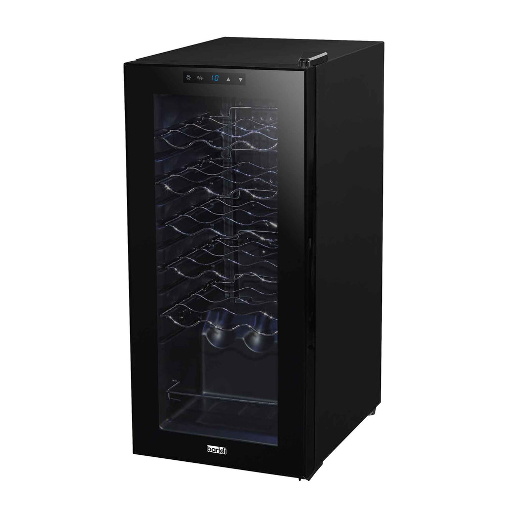 This wine cooler features a sleek and compact design, highlighted by its attractive tempered mirror glass door. Not only does it let you view your wine collection effortlessly, but it also effectively reflects UV light to protect your bottles. The appliance offers a low temperature range between 5 to 18°C, easily adjustable through touch screen controls. It utilizes advanced compressor cooling technology coupled with an automatic defrost feature, making it user-friendly and low-maintenance. Operating at a quiet 42dB, the fridge can comfortably fit under a counter or enhance the aesthetics of a kitchen countertop. With an annual energy consumption of just 120 KWh, it is both energy-efficient and cost-effective. The interior is equipped with flexible, removable waved metal shelves that can store up to 18 wine bottles, accommodating bottles with a maximum height of 330mm. Its slim dimensions of 345 x 450 x 770mm ensure a snug fit in tight spaces, blending seamlessly into your home. Please note that the cooler maintains temperatures relative to the ambient room temperature.