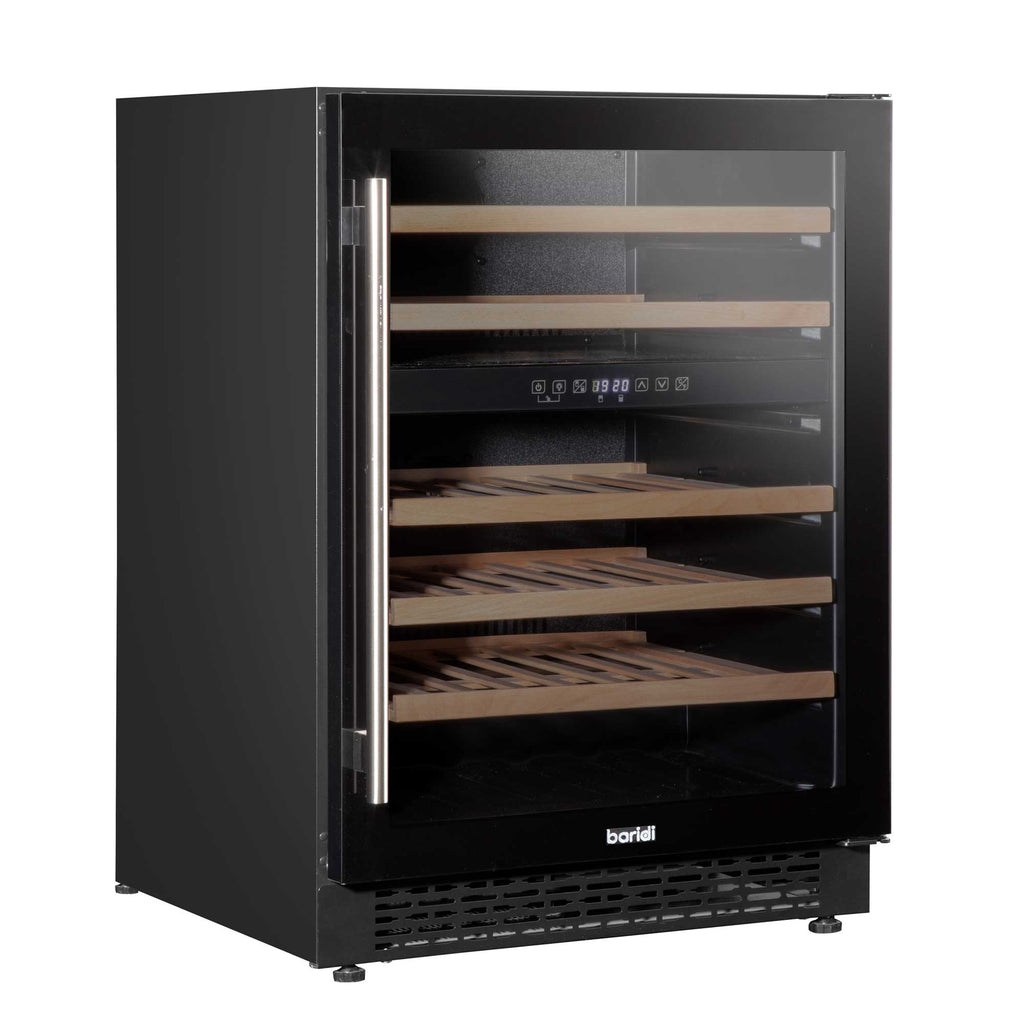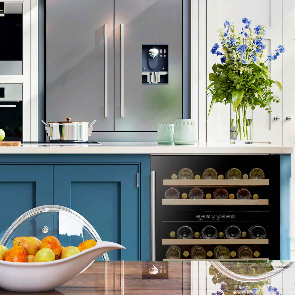 This modern wine cooler features an attractive tempered mirror glass door that reflects UV light to protect your wine collection while allowing you to easily view the contents. Its 60cm design complements your kitchen with style and fits snugly under standard worktops, positioning perfectly above kick plates. The cooler includes removable wooden shelves made of beech that add to its sophisticated appeal. With dual-zone functionality, you can set individual temperature controls between 5-22°C, ensuring that up to 46 bottles of your favorite wine are always chilled to perfection. Operating at a quiet 43dB, this fridge is suitable for under-counter placement or as a stylish addition on top of your kitchen counter, while consuming an efficient 144 KWh per year. A sleek stainless steel handle, internal LED lighting, and the option of a reversible door with adjustable feet add further versatility and convenience to its design. Measuring 595 x 570 x 820mm, this wine cooler is an elegant and practical solution for wine storage to enhance any modern kitchen.