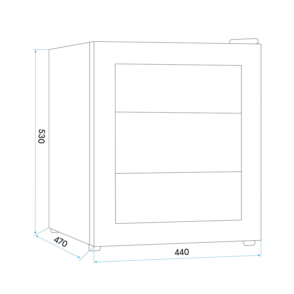This premium quality table top fridge offers a blend of efficient design and modern convenience. Its direct compressor cooling technology maintains temperatures between 3 to 10°C, ensuring your beverages stay perfectly chilled, with a built-in thermostat providing precise temperature control. Despite its compact size, this mini fridge boasts a substantial 50-litre capacity, comfortably accommodating up to 64 cans of your favorite drinks, with a net usable capacity of 46 liters. Designed for ease of use, it features an automatic defrost system, so you won't have to worry about manual maintenance, and at a mere 42dB, it operates quietly, making it suitable for any room in your home or office. This versatile counter top fridge also comes with thoughtful touches like removable waved metal shelves, reversible doors, LED lighting, and a built-in security lock, allowing you to customize its setup to meet your needs. Compact yet powerful, it can conveniently fit on or under the counter, with dimensions of 440 x 470 x 530mm, and is energy efficient with an annual consumption of 66 KWh.