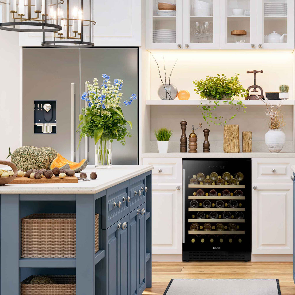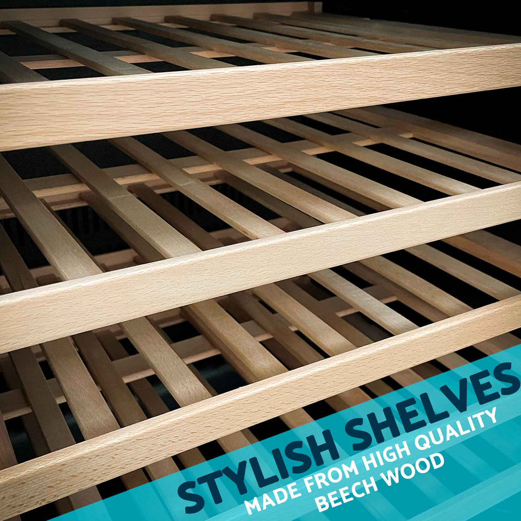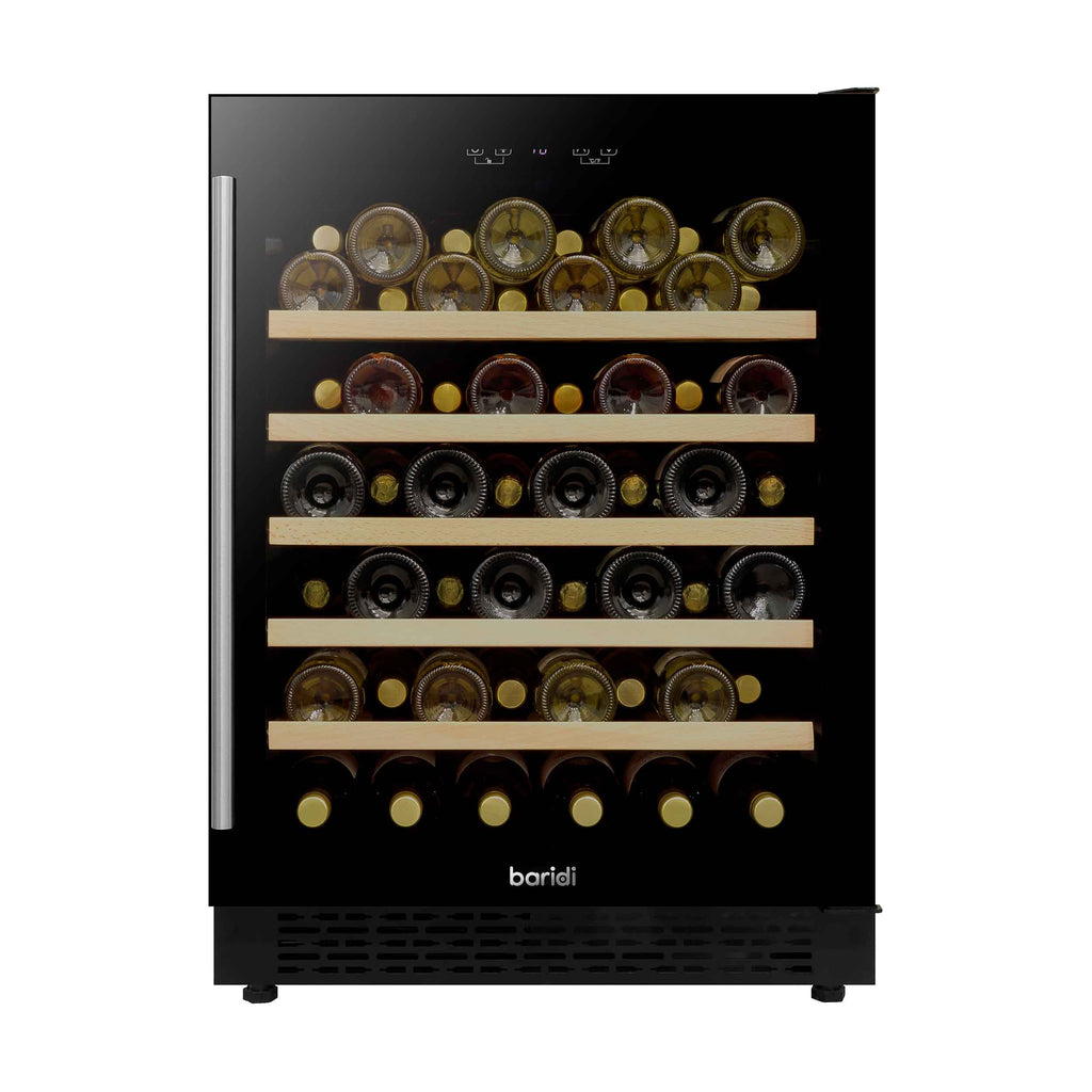Elevate your kitchen's ambiance with this 60cm wide under counter wine cooler, designed to fit seamlessly under standard-height worktops. Its sleek and modern look is complemented by a tempered mirror glass door that shields your wine from UV light while allowing you to easily view the contents. The cooler features stylish wooden shelves made from beech, offering ample space for your wine collection. With a temperature range between 5-20°C, you can effortlessly control the settings using intuitive touch screen controls. The cooler uses advanced compressor technology and has an automatic defrost function to ensure convenience and ease of use. Despite its powerful performance, it operates quietly at just 41dB, making it suitable for under-counter placement or as an elegant addition atop a kitchen counter. The stylish stainless steel door handle, wooden shelves, and internal LED lighting add to its sophisticated appeal. Practical features like a reversible door and adjustable feet make installation flexible. This wine cooler is designed to optimize your wine storage needs while consuming only 144 KWh annually. It's important to note that the unit will not reach temperatures higher than the ambient room temperature, ensuring your wine is always stored in optimal conditions. Use this wine cooler to add convenience and aesthetic value to your kitchen space.
