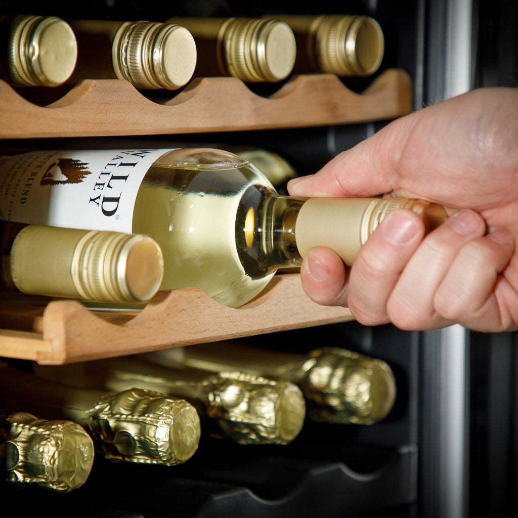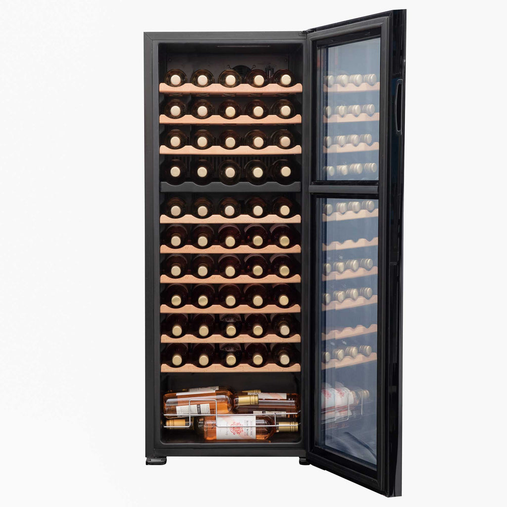 This wine cooler is designed with a sleek, tempered mirror glass door that reflects UV light to help protect your wine collection. Its dual zone design allows you to control the temperature of each section individually, offering a range between 5 and 18°C. Inside, soft white LED lighting highlights your collection stored elegantly on stylish beechwood shelves, which accommodate up to 20 bottles in the upper zone and 35 in the lower. Equipped with compressor cooling technology and an automatic defrost feature, the unit is easy to maintain and energy-efficient, with an annual consumption of 153 KWh. Despite its energy class rating of G, it operates at a moderate noise level of 45dB, preserving a peaceful environment. The dimensions of the cooler are 510 x 480 x 1260mm, suitable for bottles up to 320mm high. To ensure optimal performance and longevity, leave a minimum ventilation space of 50mm at the rear and 30mm at both the top and sides. Keep in mind that the cooler's maximum temperature is limited by the room's ambient temperature. This elegant appliance is both a practical and attractive addition for wine enthusiasts looking to store their collection with care.