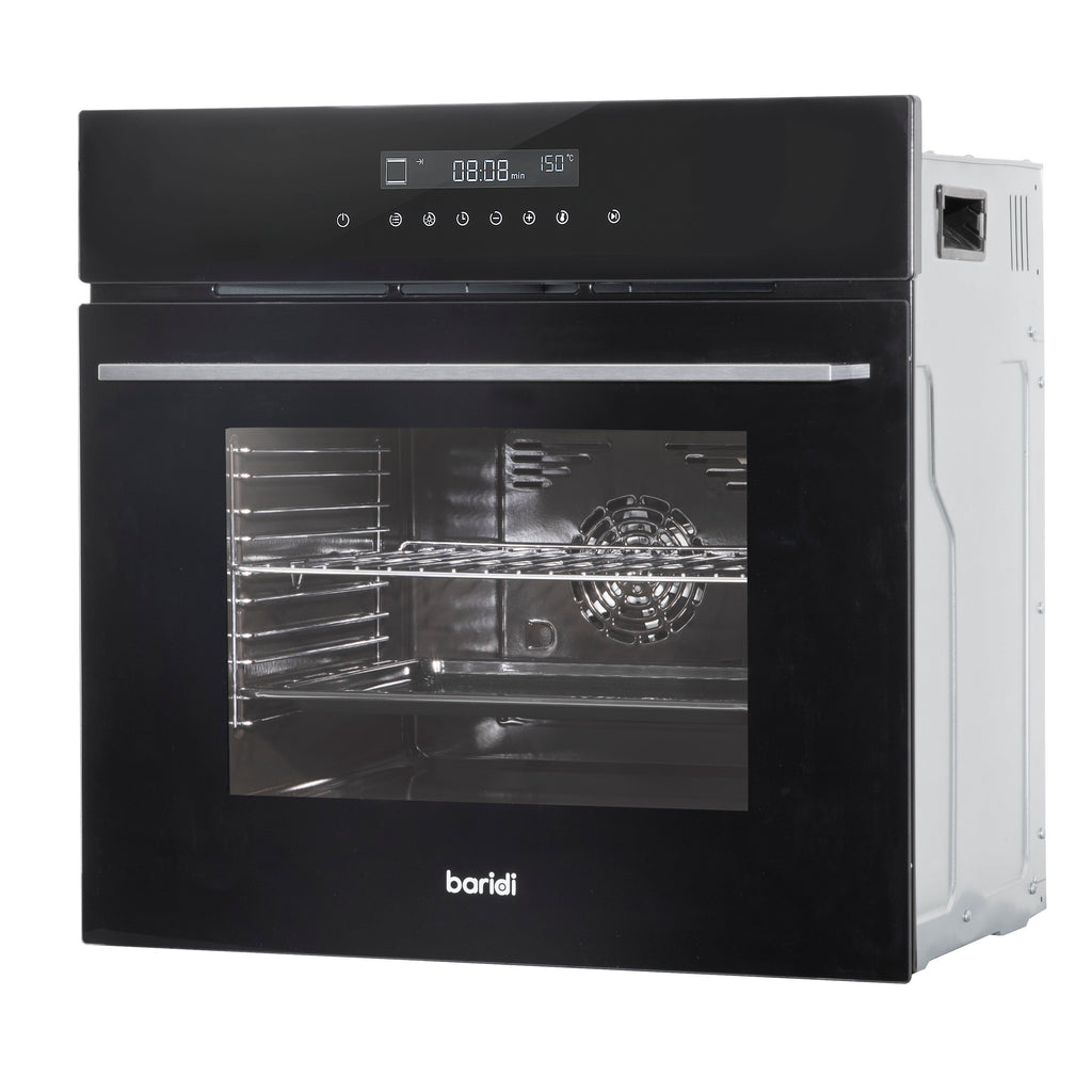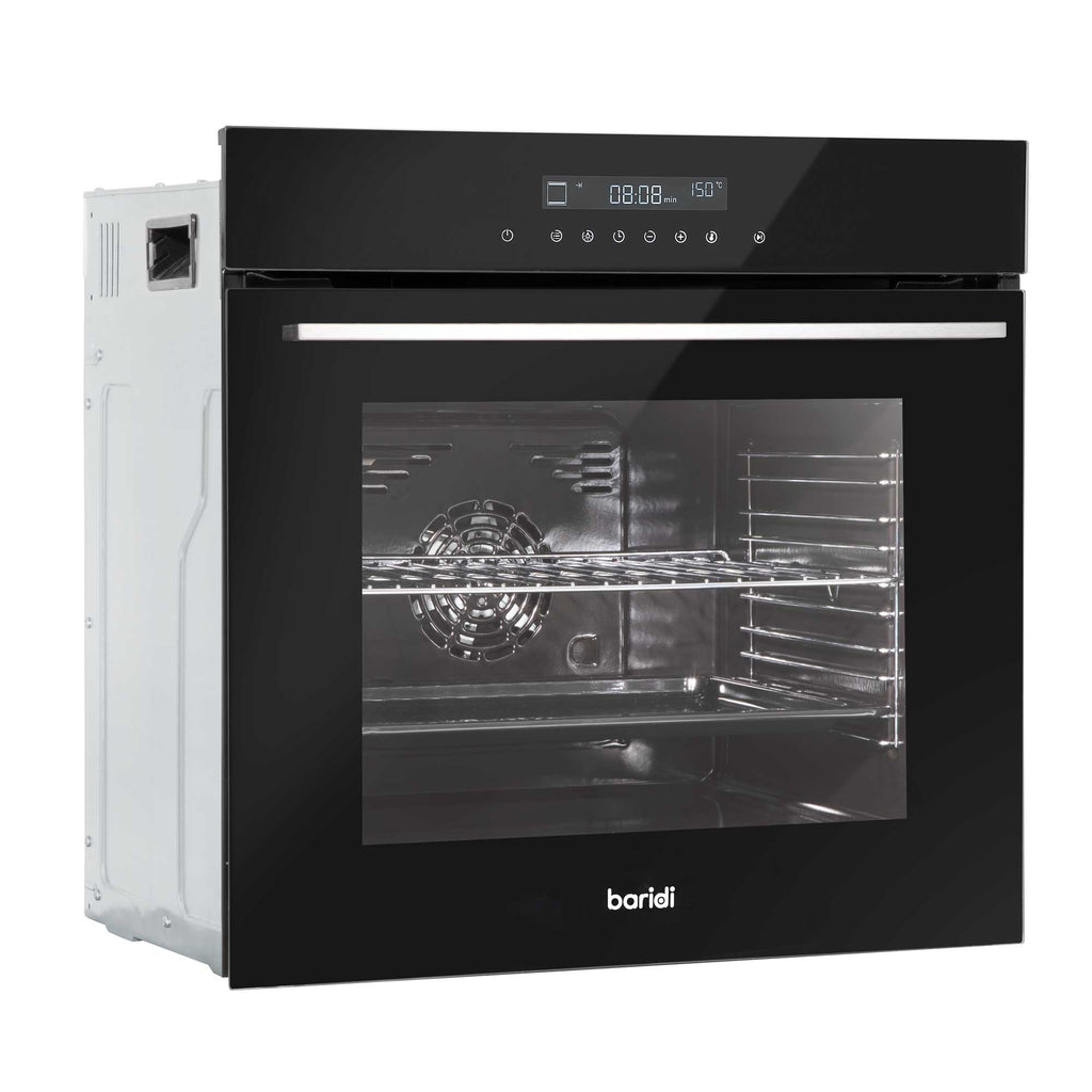 This oven is designed to make cooking easier and more enjoyable with its large 72-liter capacity and consistent temperature control. The touchscreen interface allows for easy operation, and with ten different cooking functions, you can take on any recipe with confidence. Whether you're preheating rapidly, baking intensively, or using the efficient ECO mode for single-shelf cooking, this oven ensures your meals are perfectly cooked. The ten shelf positions add to its versatility, and with the included baking tray and grill shelf, you can start your culinary creations right away. It is designed with compatibility in mind, seamlessly complementing Baridi cooker hoods, hobs, wine coolers and drinks fridges. With an overall size of 595 x 595 x 595mm and internal dimensions of 480 x 415 x 360mm, this oven fits well into most kitchen spaces while offering generous space for your cooking needs.
