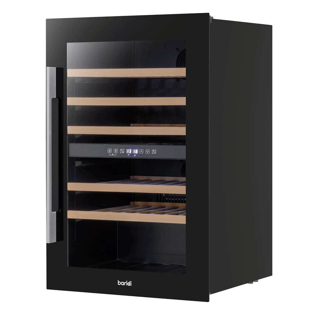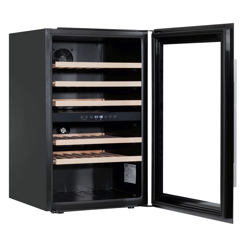 This wine fridge is a practical and stylish addition to any kitchen, fitting easily into a standard cabinet space with its compact 60cm width. With its dual zone design, you can set different temperatures for the upper and lower zones, ranging from 5 to 22°C, allowing you to store your wines at the optimal temperature. Despite its capacity to chill up to 57 bottles, the fridge operates quietly at just 38 dB, ensuring it won’t disturb the peace in your home. It is energy efficient as well, with an annual energy consumption of just 148 KWh. The fridge boasts an elegant design with a stainless steel handle, beech wood shelves, and a soft, internal LED light that adds a touch of sophistication to your kitchen. The dimensions of 590 x 563 x 885 mm make it a compact yet capable choice for wine enthusiasts who want functionality and style.
