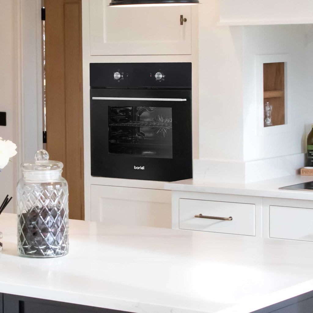 This versatile oven offers a generous 55-liter capacity, providing ample space to prepare your favorite meals with consistent temperatures for optimal results. It features five convenient cooking functions, including Grill, Bottom Heating, Conventional - Top and Bottom Heating, Defrost, and an energy-efficient ECO mode. The ECO function is particularly efficient when cooking on a single shelf, using a low power setting for the heating elements and fan. Experience even heat distribution thanks to the 1300W top element and 1000W bottom element, ensuring a smooth and flawless cooking process. With four customizable shelf positions and included accessories like a baking tray and grill shelf, this oven provides the flexibility you need to start cooking immediately. Designed to seamlessly integrate with Baridi cooker hoods, hobs, and a range of wine coolers and drinks fridges, this oven not only performs exceptionally but also complements your kitchen's aesthetic. The oven's overall dimensions are 595 x 520 x 590mm, with internal dimensions of 425 x 370 x 345mm.