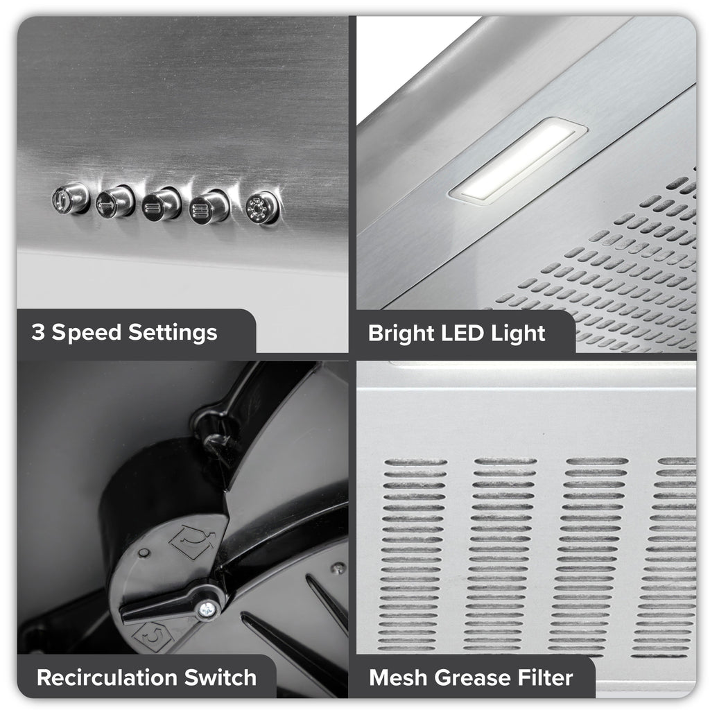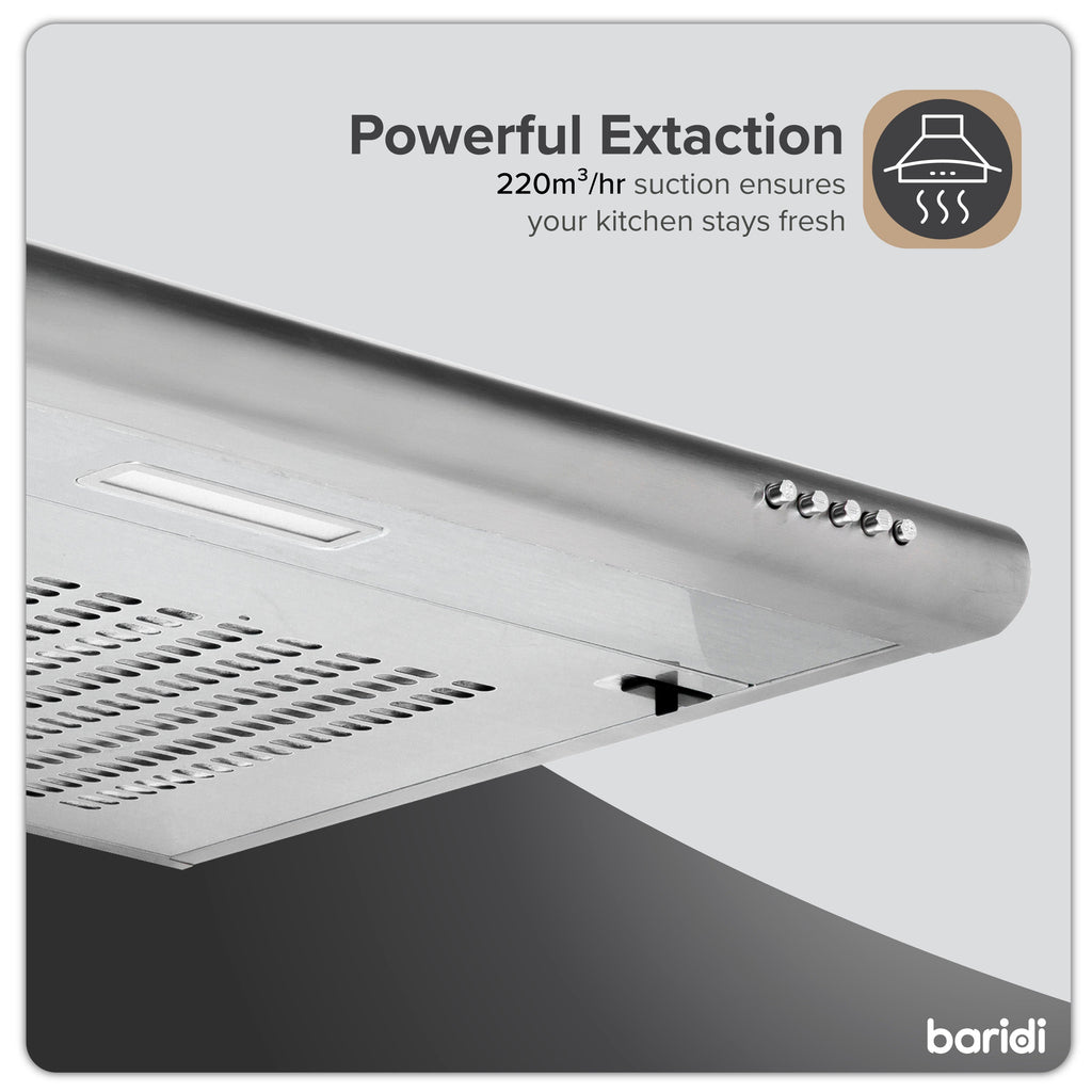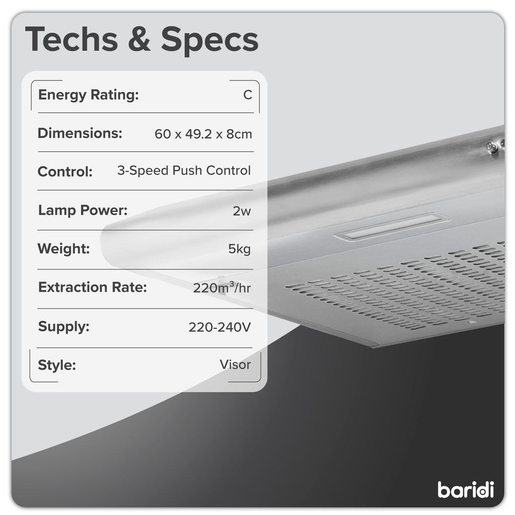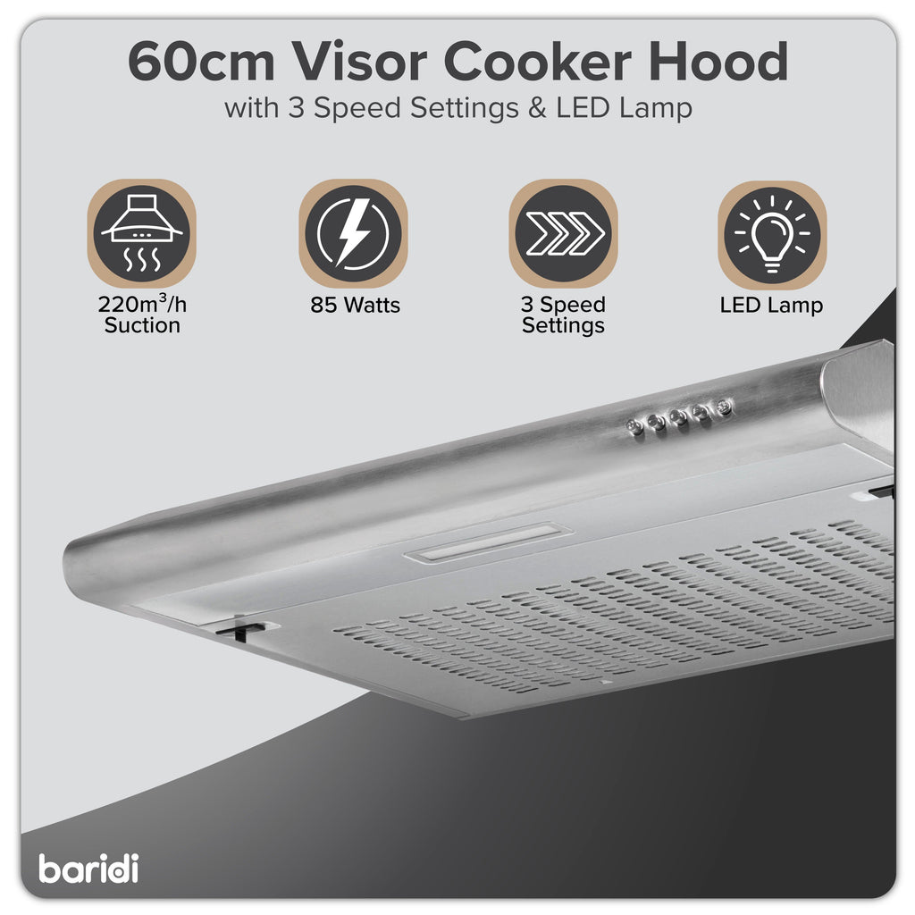 This chimney-style cooker hood is designed to efficiently freshen up your kitchen with its powerful 85-watt fan, which offers a robust suction capability of 220m3/h, effectively keeping cooking fumes at bay. With three adjustable fan speeds, you have the flexibility to control the ventilation according to your cooking needs. The hood is versatile, coming equipped with a carbon filter that allows you to choose between recirculating the air or venting it externally, ensuring your kitchen stays fresh. Measuring 60cm, it's a standard size that fits most cookers and hobs seamlessly. The modern and elegant design of this wall-mounted hood adds a touch of style to any kitchen. Additionally, it features a 2W LED light, providing a bright and energy-efficient way to illuminate your cooking area, enhancing your cooking experience while keeping energy consumption low.