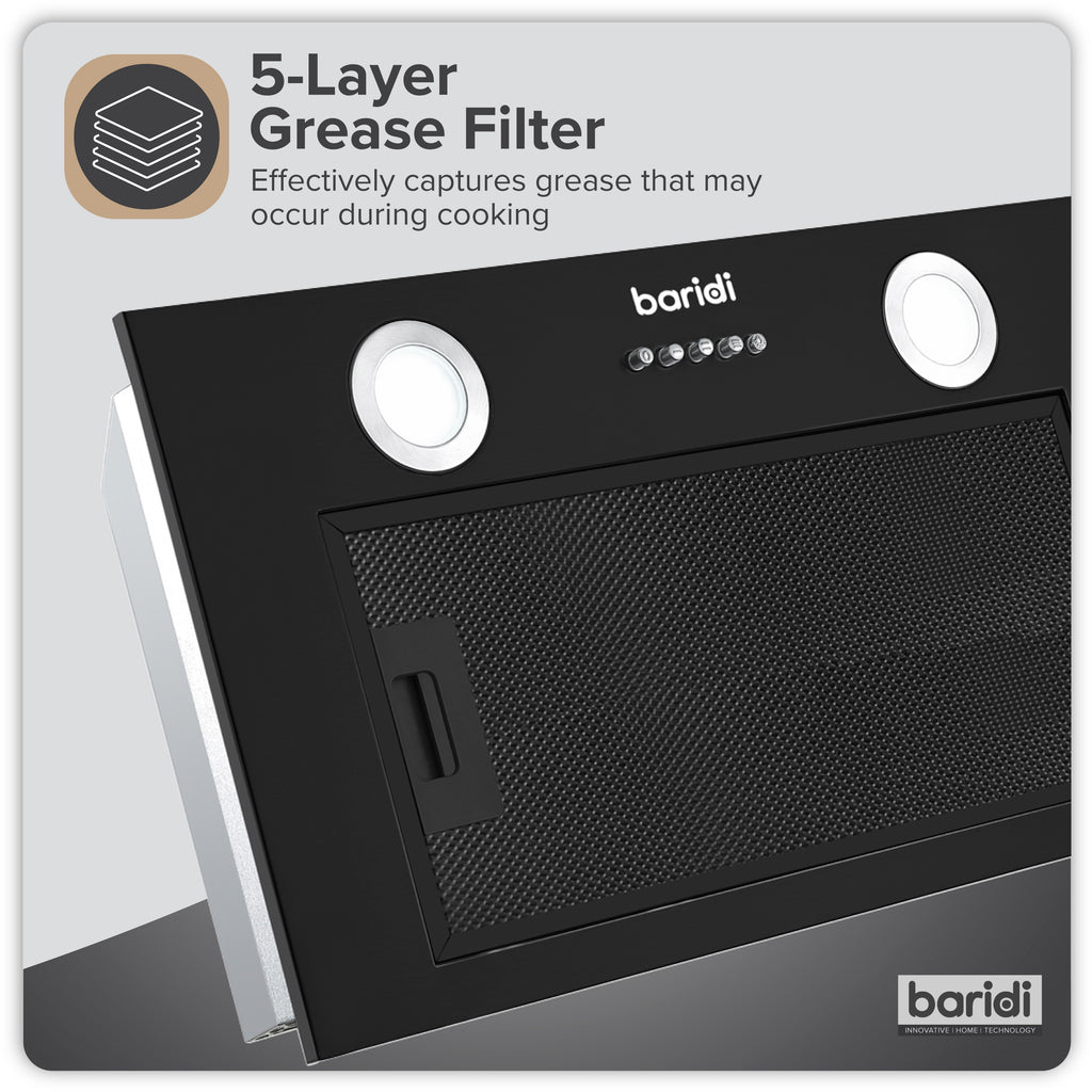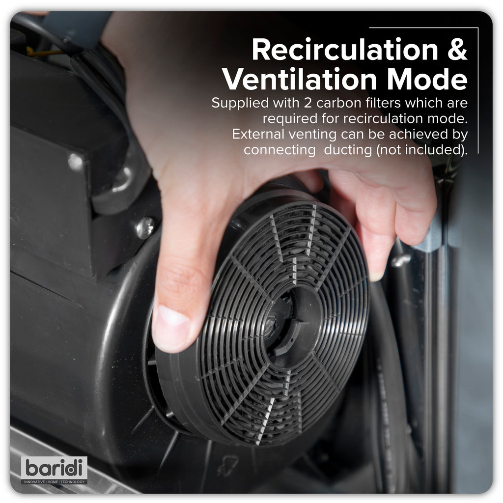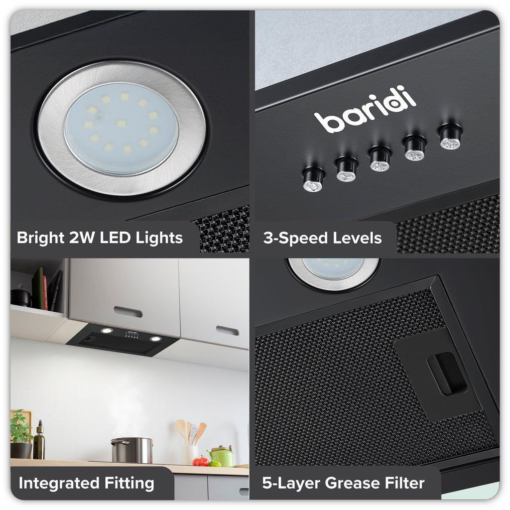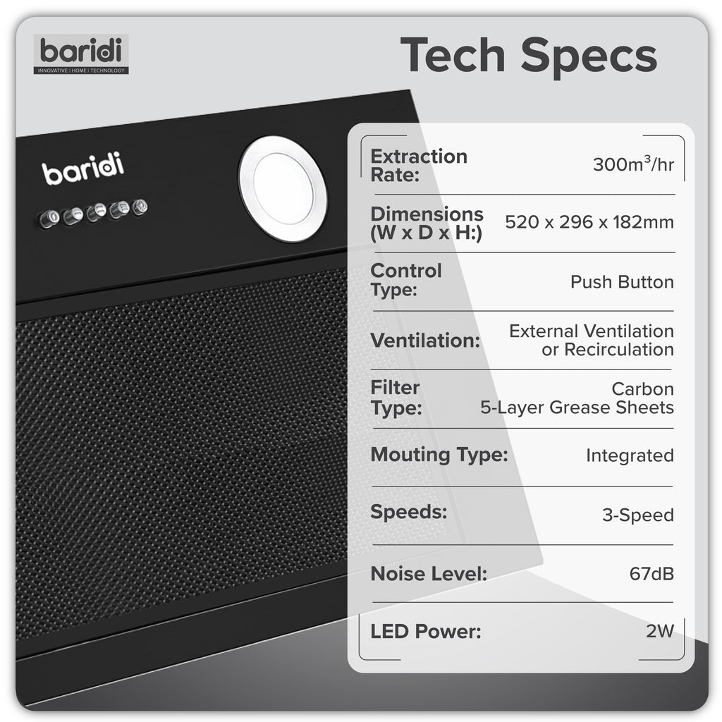 This 52 cm wall-mounted extractor hood combines efficiency, power, and style, making it a practical addition to most kitchens. Rated class A for energy efficiency, it uses less electricity than standard B or C-rated hoods while operating more quietly, allowing the fan to run at full power without increasing energy costs. The 33 W motor delivers 300 m³/h of suction across three fan speeds, ensuring cooking fumes are quickly removed and fresh air is maintained throughout the kitchen. A five-layer aluminium filter captures grease and particles, making maintenance simple and helping to preserve air quality. Its sleek, modern design complements a variety of kitchen styles, and the compact dimensions (52 × 29.6 × 18.2 cm) allow it to fit neatly above most cookers and hobs. Must be installed by a qualified electrician; ducting kit is not supplied.