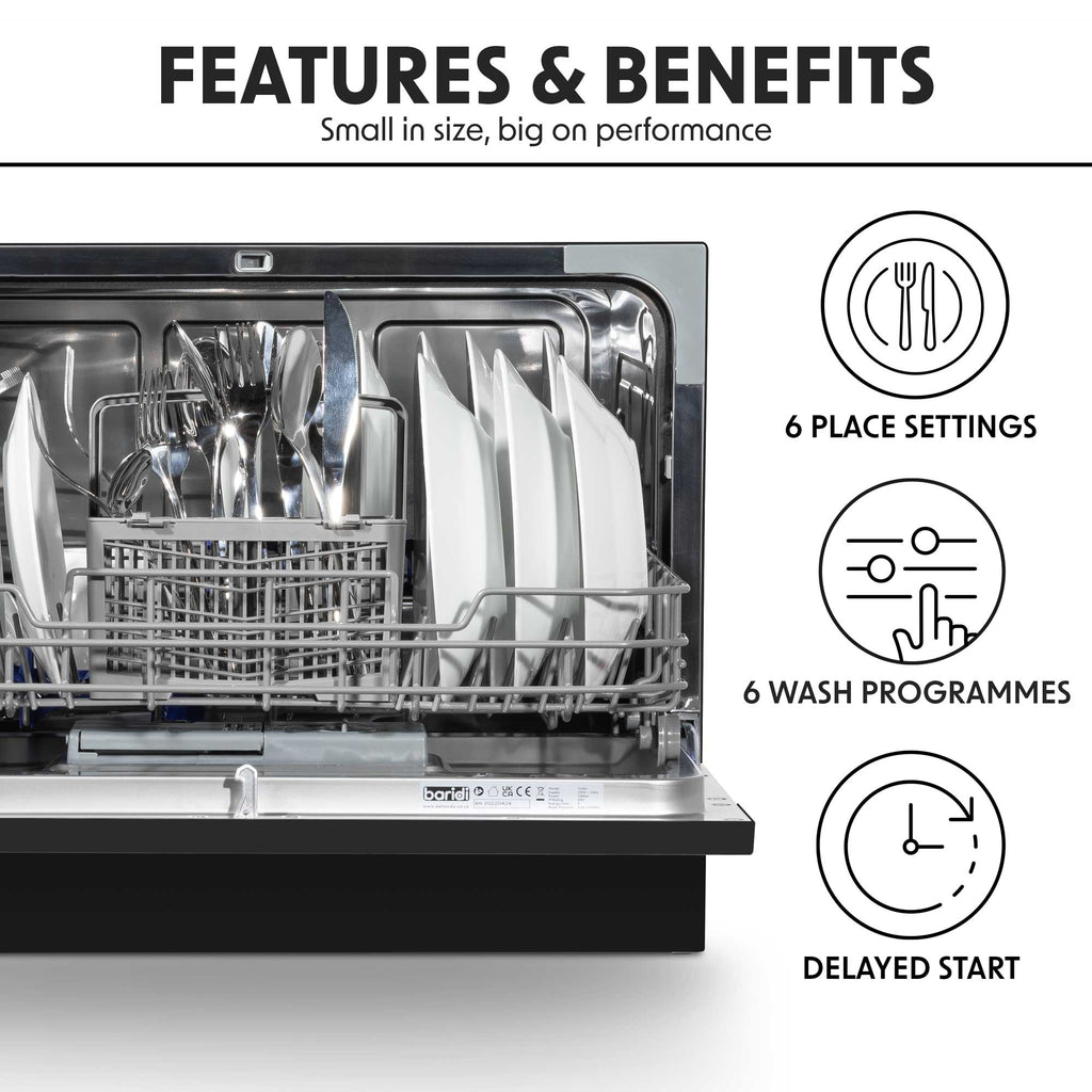 This compact dishwasher is designed to fit seamlessly into any kitchen, with its small size making it a versatile option that can be placed on a countertop or installed in a cupboard. It offers the convenience of handling up to six place settings, making it ideal for small families or individuals, and can accommodate a maximum plate size of 25 cm. The dishwasher includes six different wash programs, such as Intensive, Normal, and Eco, along with delayed start options ranging from 2 to 8 hours. This feature allows users to save on energy costs by setting it to operate during off-peak hours or to start a cycle when they are not home. Connecting this dishwasher is straightforward, whether using standard plumbing or a temporary connection to a kitchen tap with the appropriate adaptor. With dimensions of 550 x 500 x 438 mm, it optimizes space without compromising functionality. Its efficient use of water, consuming only 6.5 liters per cycle, makes it more economical than washing dishes by hand. The energy-efficient design is classified as Energy Class F, and the waste pipe, which can be either plumbed or directed toward the plug drain, comes with a generous length of 1700 mm to provide flexible installation options.