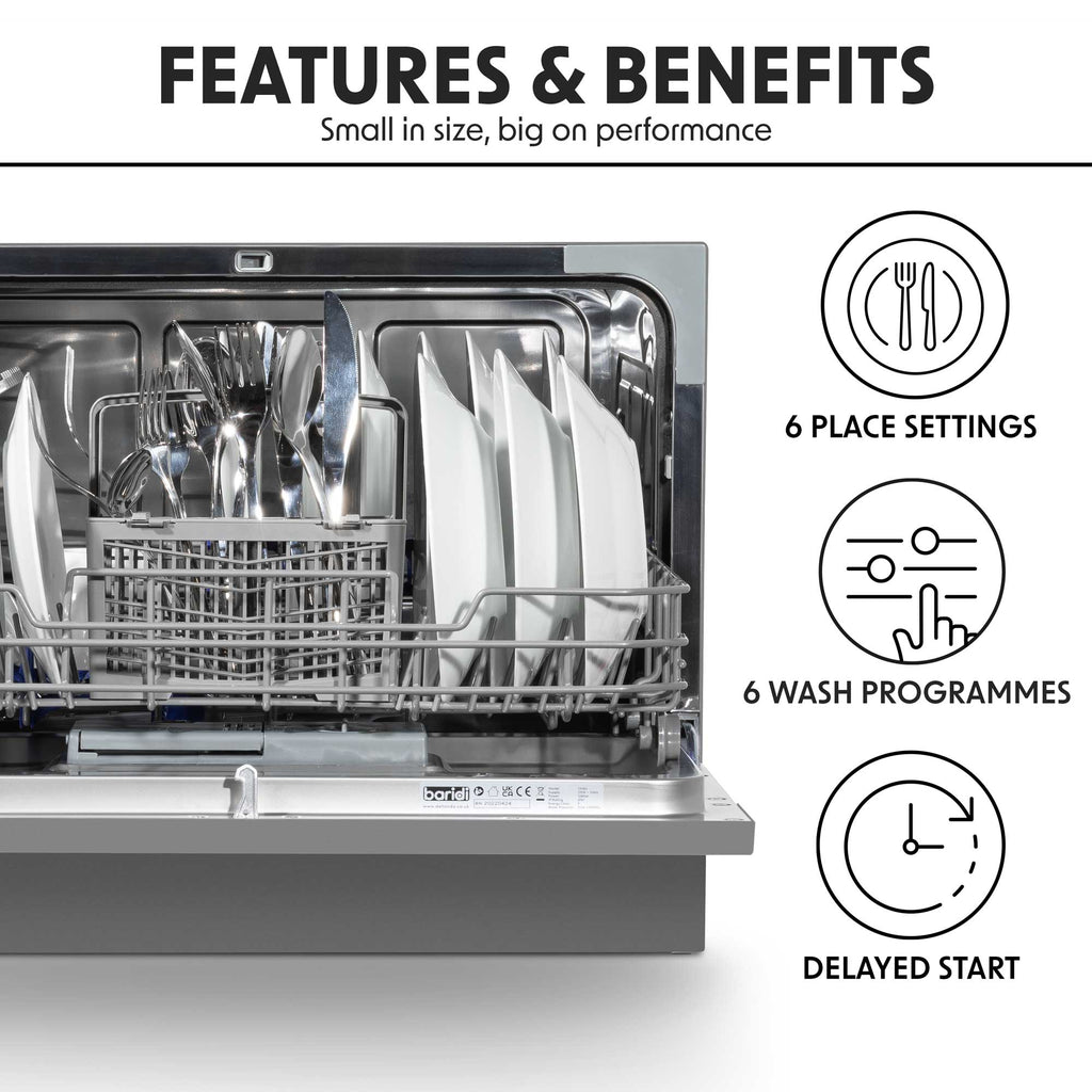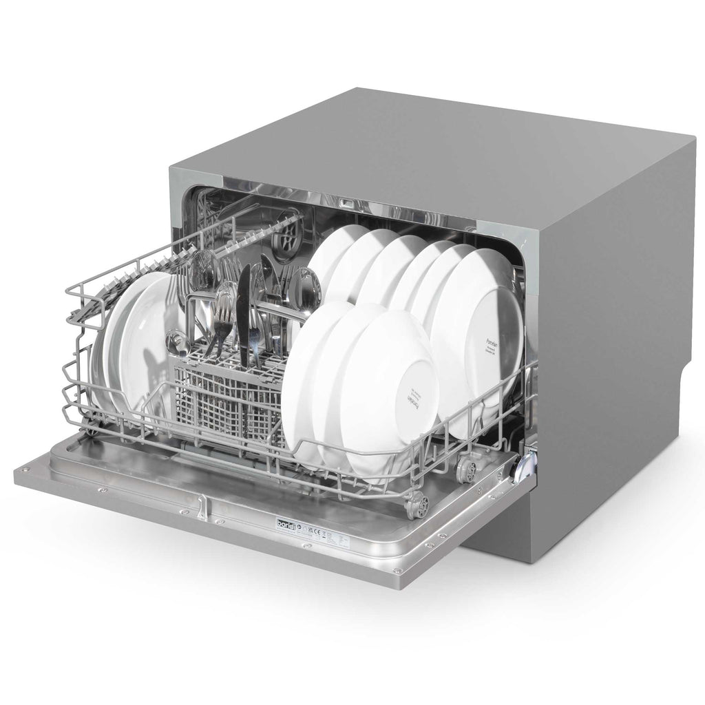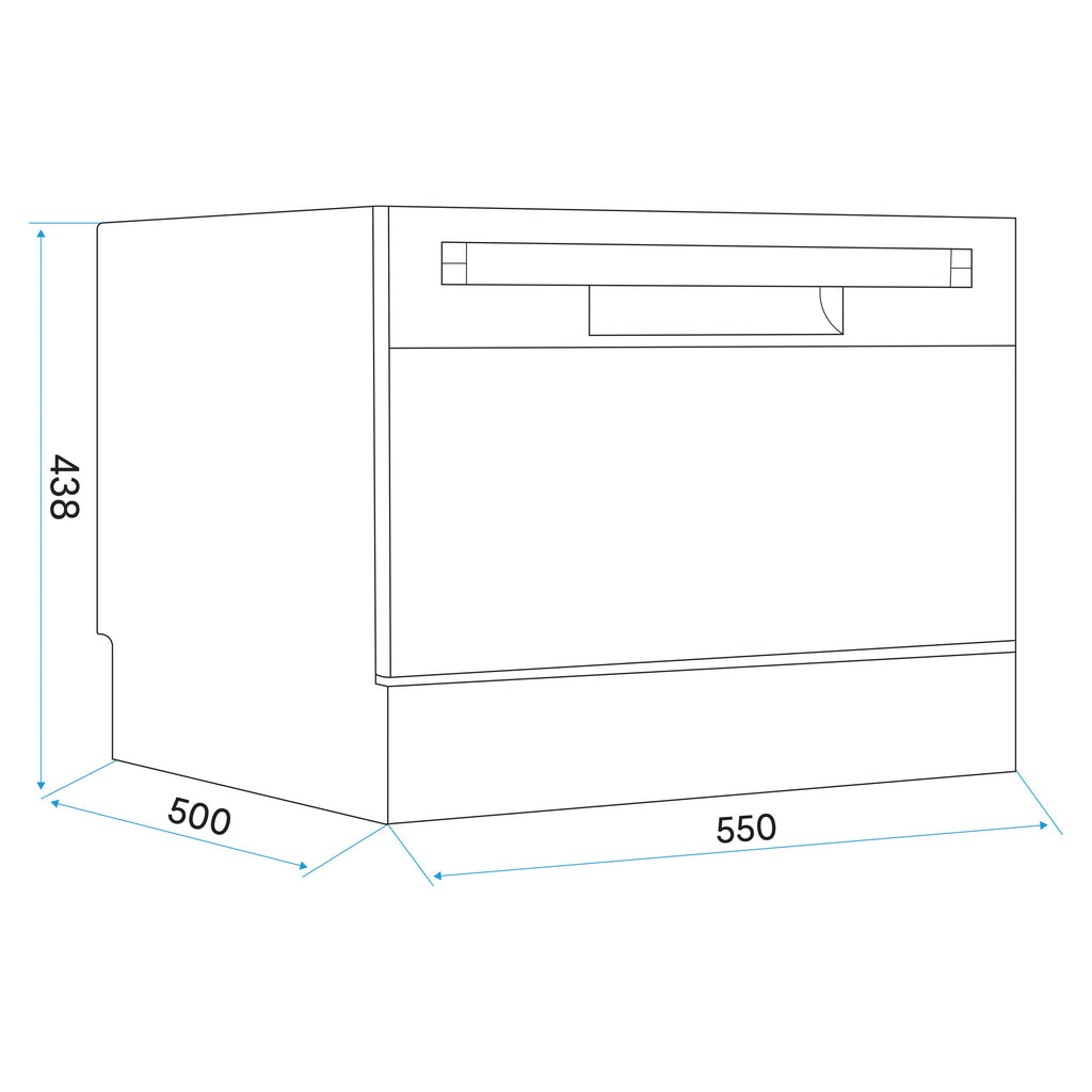 This compact dishwasher is an ideal fit for any kitchen, blending seamlessly with its contemporary design and flexible installation options. Whether placed on a countertop or tucked into a cupboard, its space-saving size ensures it won't crowd your culinary area. With the capacity to handle up to six place settings, it is perfect for small families or individuals, accommodating plates up to 25cm in diameter. The dishwasher offers six wash programs including Intensive, Normal, Eco, Glass, a 90-minute cycle, and a 30-minute Rapid Clean, allowing you to choose the best option for your needs. The delayed start feature, with settings from 2 to 8 hours, provides the convenience of washing overnight or during off-peak energy times. Installation is straightforward, connecting like a typical dishwasher or temporarily to a kitchen tap using an easily obtainable adaptor. Despite its energy class F rating, it conserves water efficiently, using only 6.5 liters per cycle. The 1.7-meter waste pipe can be plumbed into your system or simply directed toward the drain, offering flexibility in setup. With these features, it delivers effective dishwashing solutions tailored to modern living spaces.