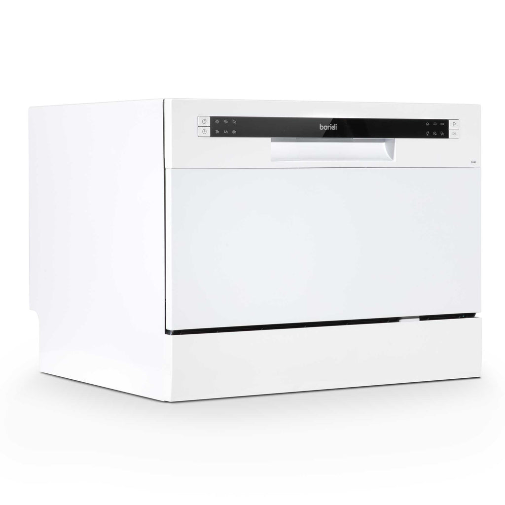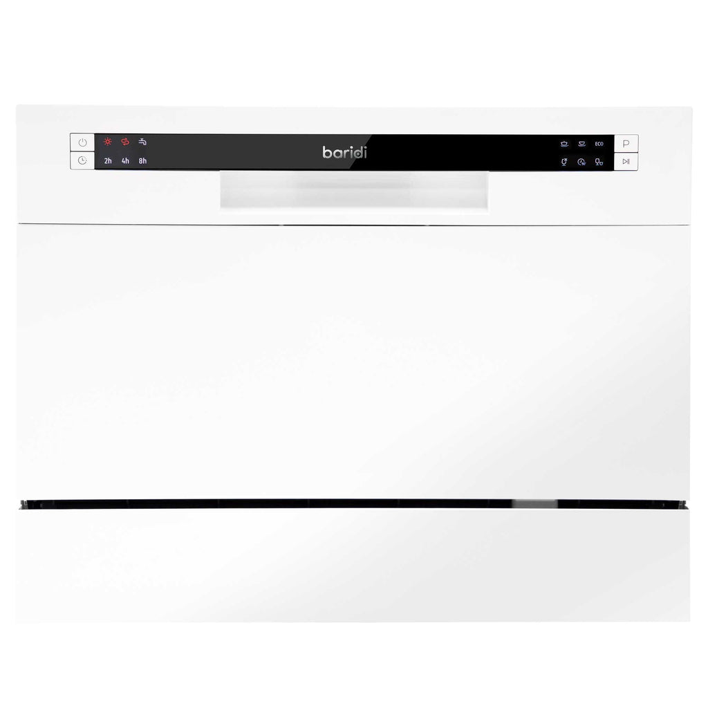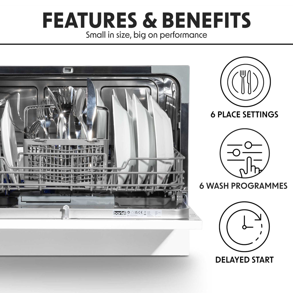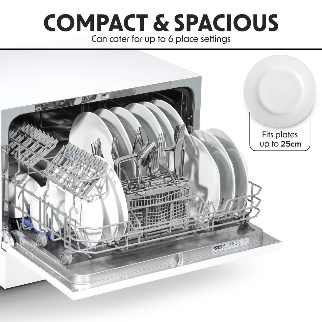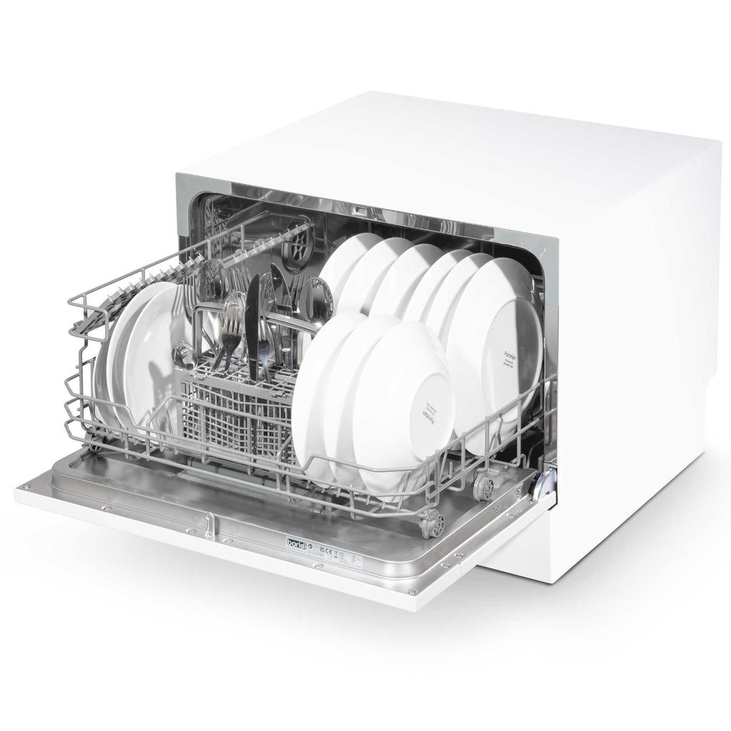 This compact and convenient dishwasher is a great solution for any kitchen, big or small, thanks to its small size and contemporary design. It easily fits on a countertop or in a suitably-sized cupboard without sacrificing style. It efficiently handles up to 6 place settings, perfect for small families or individuals, with a maximum plate size of 25 cm. The dishwasher offers a range of functionalities, including delayed start options of 2, 4, 6, or 8 hours, allowing you to run it at night for cheaper energy rates or while you are away. It comes with six versatile wash programs: Intensive, Normal, Eco, Glass, 90 minutes, and a 30-minute Rapid Clean. It's simple to use with a standard dishwasher connection, or it can be temporarily attached to a kitchen tap using an easily purchased adaptor. Measuring 550 x 500 x 438 mm, it is compact yet powerful, using just 6.5 liters of water per cycleless than washing by hand. Its energy class is F, and it features a 1700 mm waste pipe that can be plumbed in or directed toward a plug drain.