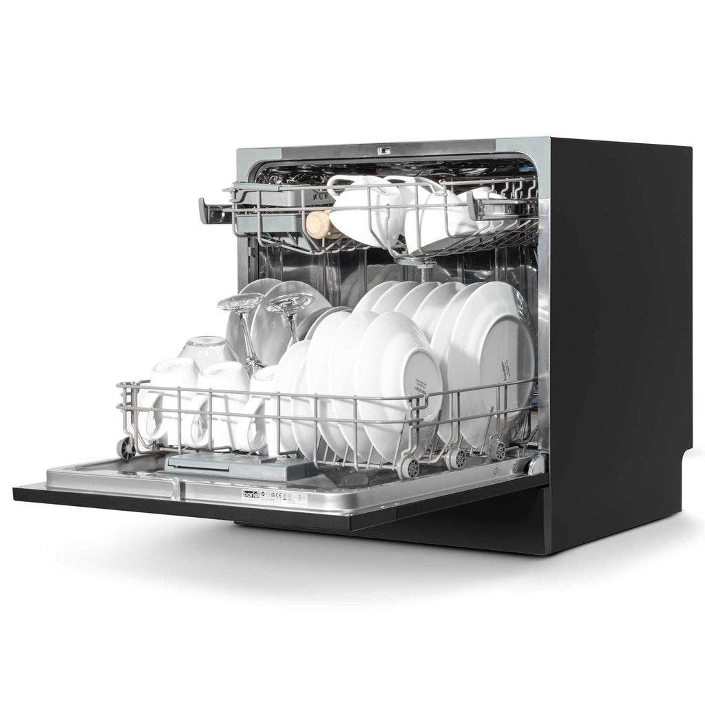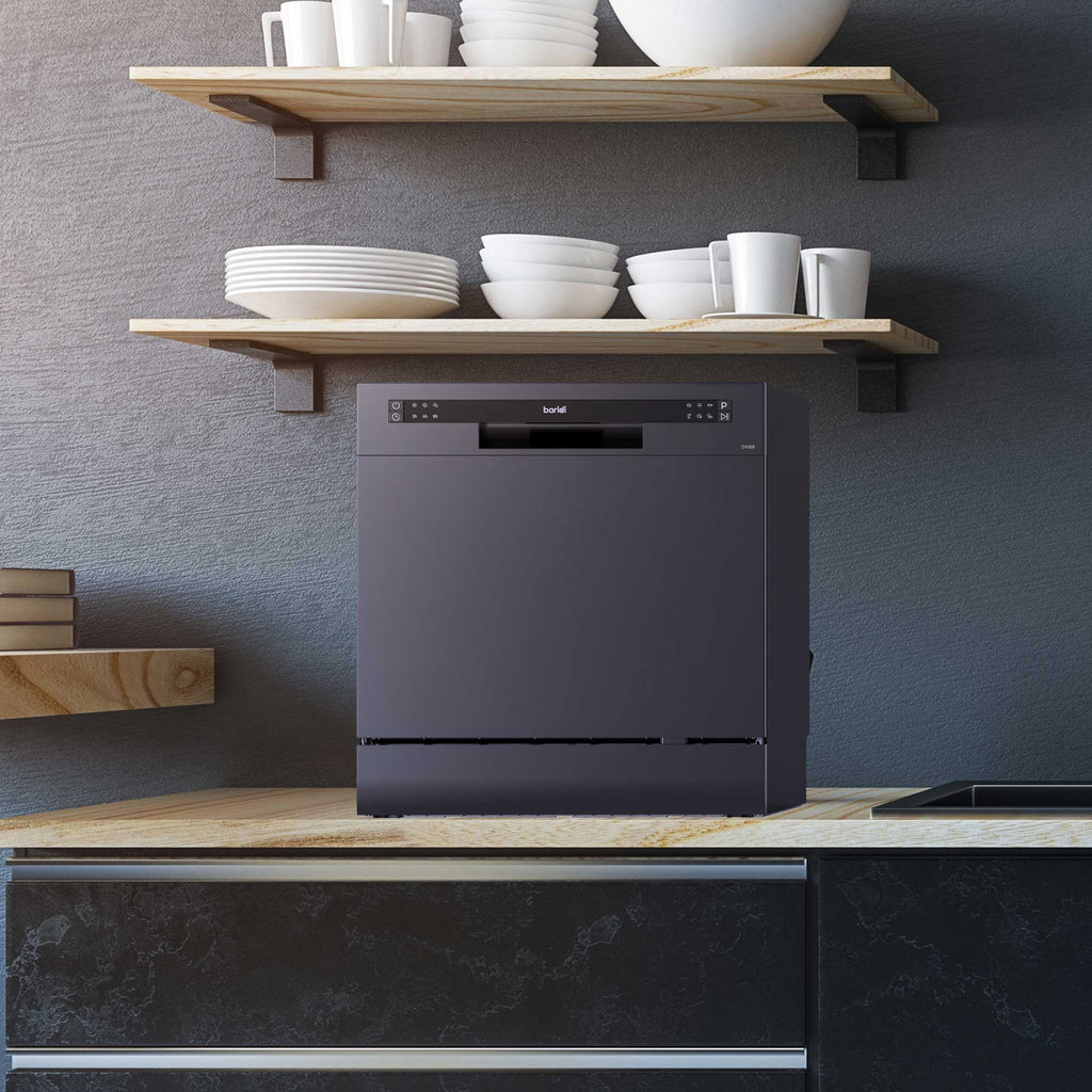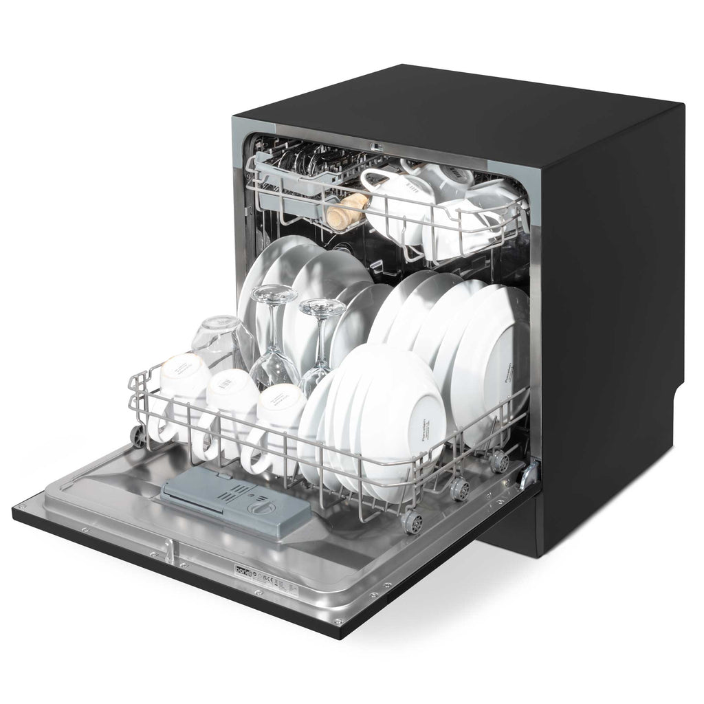 The compact and convenient size of this dishwasher makes it an excellent addition to any kitchen, as it can fit on a countertop or inside a suitably-sized cupboard. Its contemporary design complements various kitchen styles, adding versatility to its appeal. Despite its small size, the dishwasher has an impressive capacity, able to handle up to 8 place settings, which is perfect for a small family or an individual. It accommodates plates up to 30cm, but those placed under the spray arms should be no larger than 25cm. This dishwasher offers multiple functions to fit different needs, including a delayed start option that allows you to schedule washing cycles during off-peak hours when energy rates are lower. There are six wash programmes available: Intensive, Normal, Eco, Glass, a 90-minute cycle, and a 30-minute rapid clean, providing flexibility for various cleaning requirements. Setting it up is simple, as it connects like any standard dishwasher. Additionally, for temporary use, it can be connected to a kitchen tap with an adaptor available from most hardware stores. Measuring 550 x 500 x 595mm, it is classified as Energy Class F and uses only 8 liters of water per cycle, making it more efficient than washing dishes by hand. The waste pipe is 1700mm long and can be either plumbed in or directed toward the plug drain for convenience.
