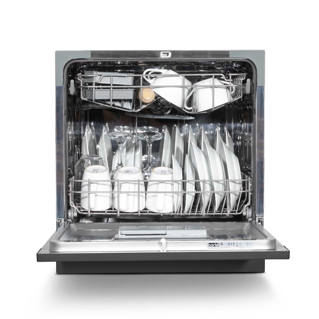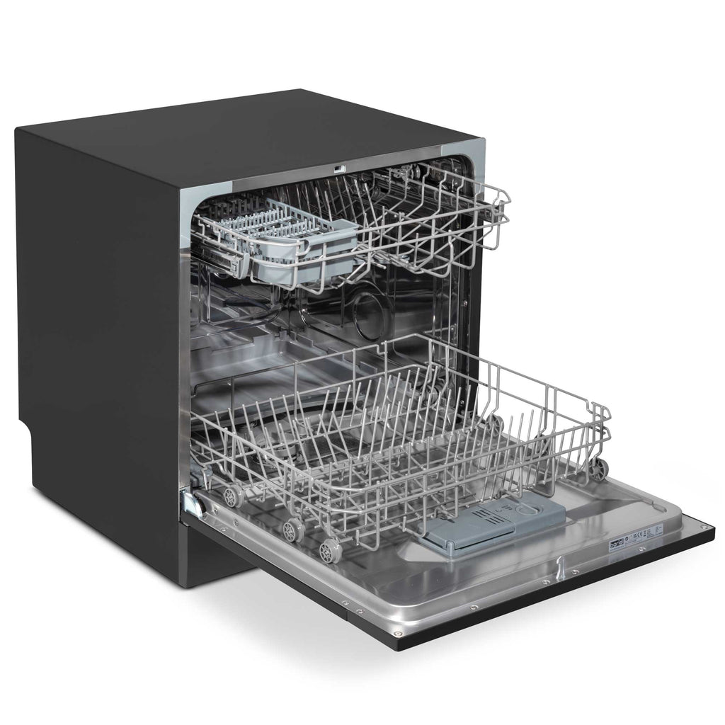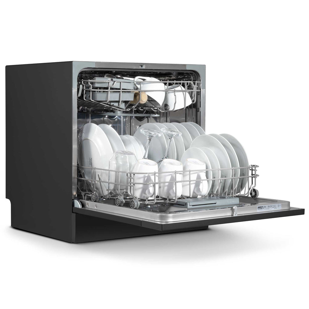 The compact and convenient size of this dishwasher makes it an excellent addition to any kitchen, as it can fit on a countertop or inside a suitably-sized cupboard. Its contemporary design complements various kitchen styles, adding versatility to its appeal. Despite its small size, the dishwasher has an impressive capacity, able to handle up to 8 place settings, which is perfect for a small family or an individual. It accommodates plates up to 30cm, but those placed under the spray arms should be no larger than 25cm. This dishwasher offers multiple functions to fit different needs, including a delayed start option that allows you to schedule washing cycles during off-peak hours when energy rates are lower. There are six wash programmes available: Intensive, Normal, Eco, Glass, a 90-minute cycle, and a 30-minute rapid clean, providing flexibility for various cleaning requirements. Setting it up is simple, as it connects like any standard dishwasher. Additionally, for temporary use, it can be connected to a kitchen tap with an adaptor available from most hardware stores. Measuring 550 x 500 x 595mm, it is classified as Energy Class F and uses only 8 liters of water per cycle, making it more efficient than washing dishes by hand. The waste pipe is 1700mm long and can be either plumbed in or directed toward the plug drain for convenience.
