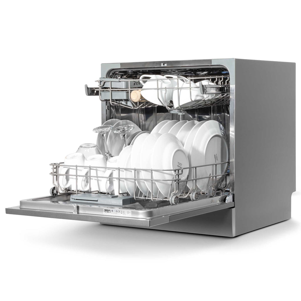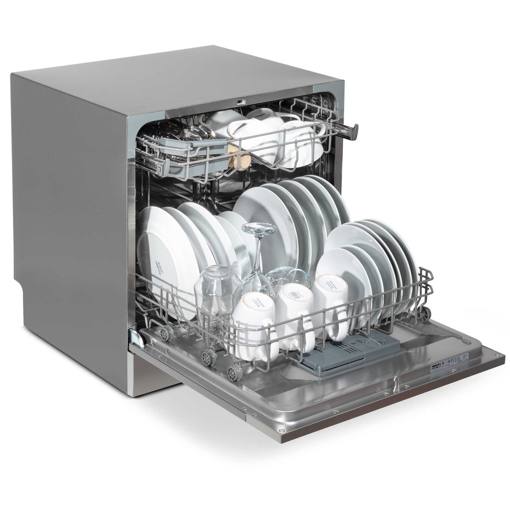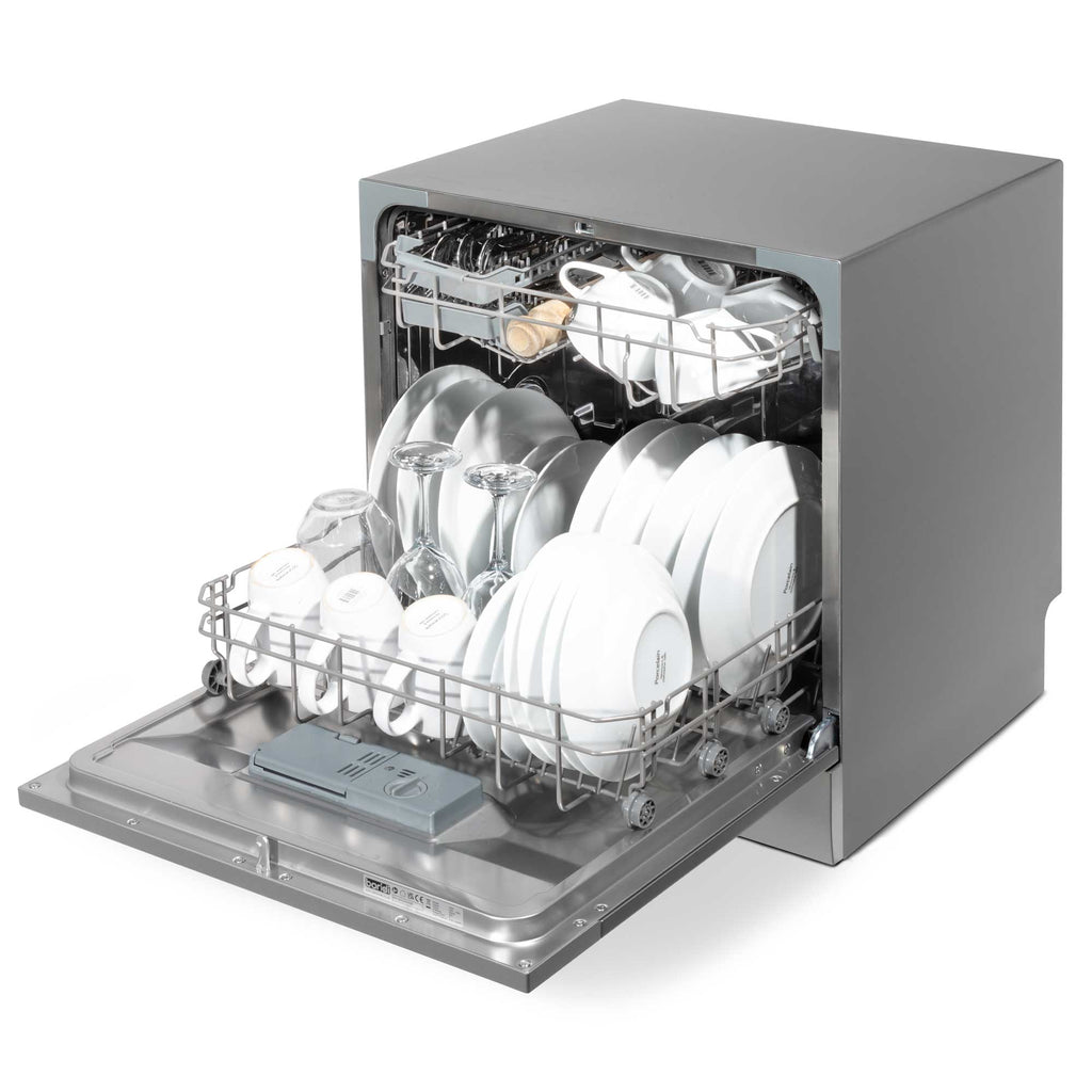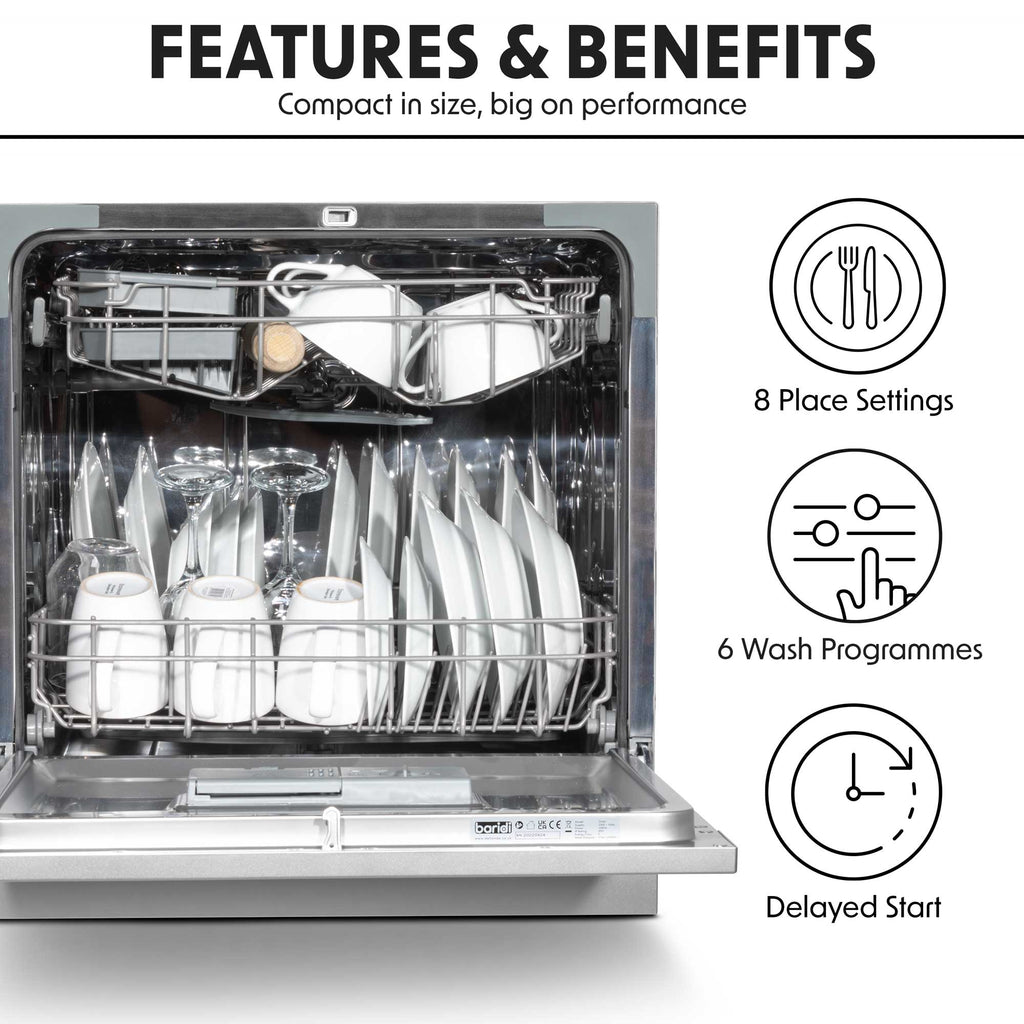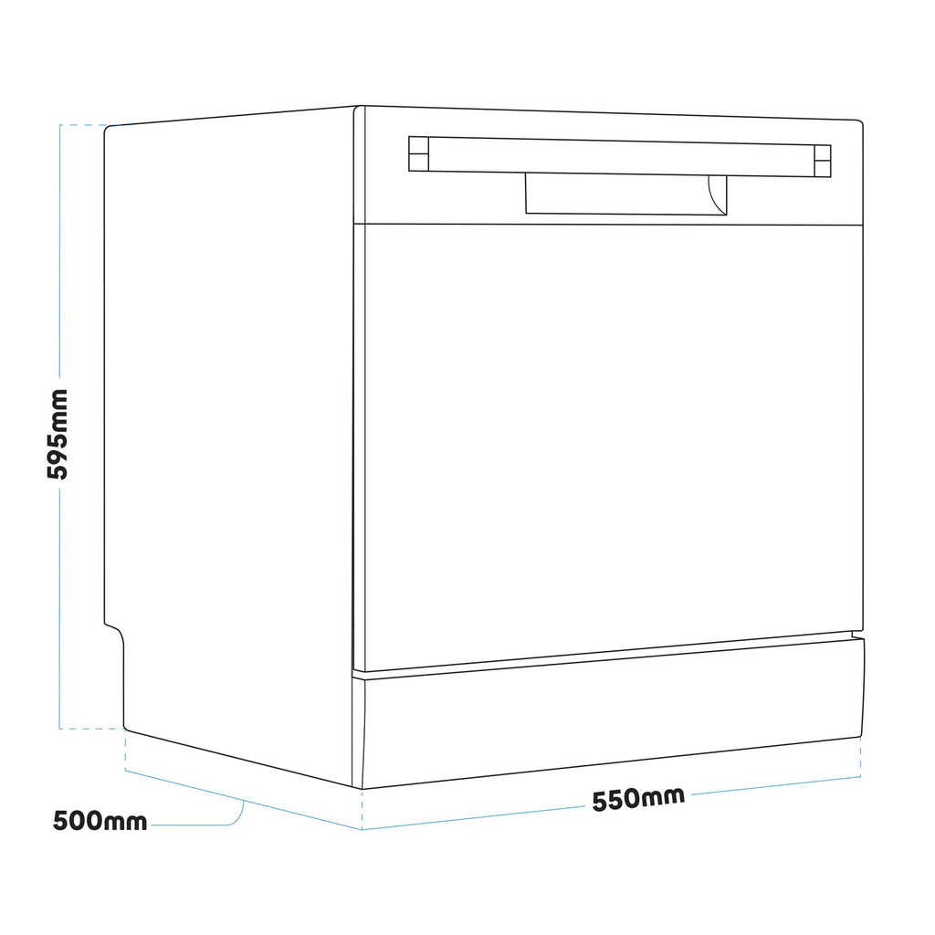 This compact dishwasher is designed to fit seamlessly into any kitchen, no matter the size, thanks to its convenient dimensions and stylish look. Whether placed on a countertop or installed in a cupboard, it enhances kitchen functionality without taking up too much space. Surprisingly versatile, this small appliance can handle up to eight place settings, making it suitable for small families or individual use. It's capable of accommodating plates up to 30 cm, though larger plates must be placed away from the spray arms. The dishwasher offers a variety of features to suit different needs, including six wash programs ranging from an intensive clean to an eco-friendly cycle. With delayed start options of up to eight hours, you can schedule washes to take advantage of lower energy rates or have it run while you're out. Installation is simple, as it connects like a standard dishwasher, although it can also be temporarily adapted to a kitchen tap if needed. This model is energy efficient, with a water consumption of only 8 liters per cycle, making it a more sustainable choice compared to hand washing. The waste pipe can be easily plumbed in or directed towards the plug drain, offering flexibility in setup. With its combination of performance and convenience, this dishwasher is a practical addition to any home.
