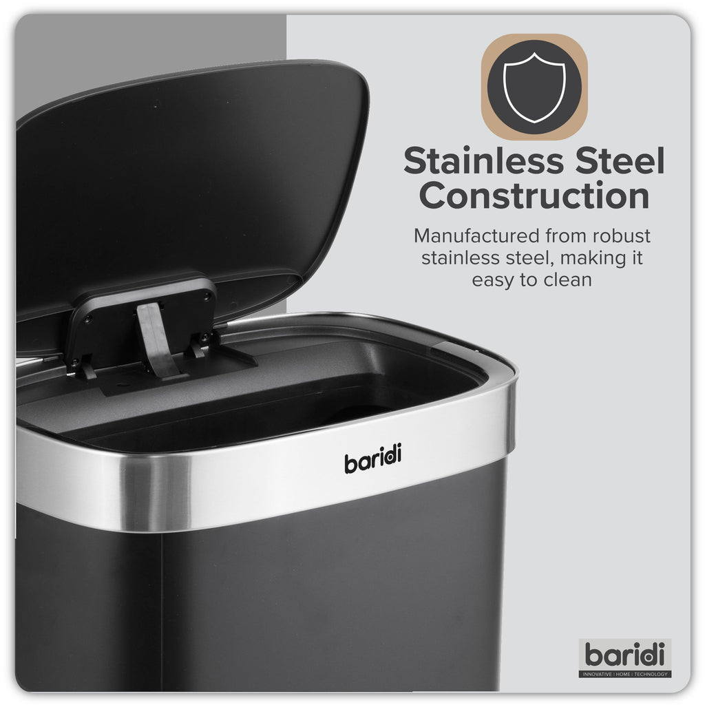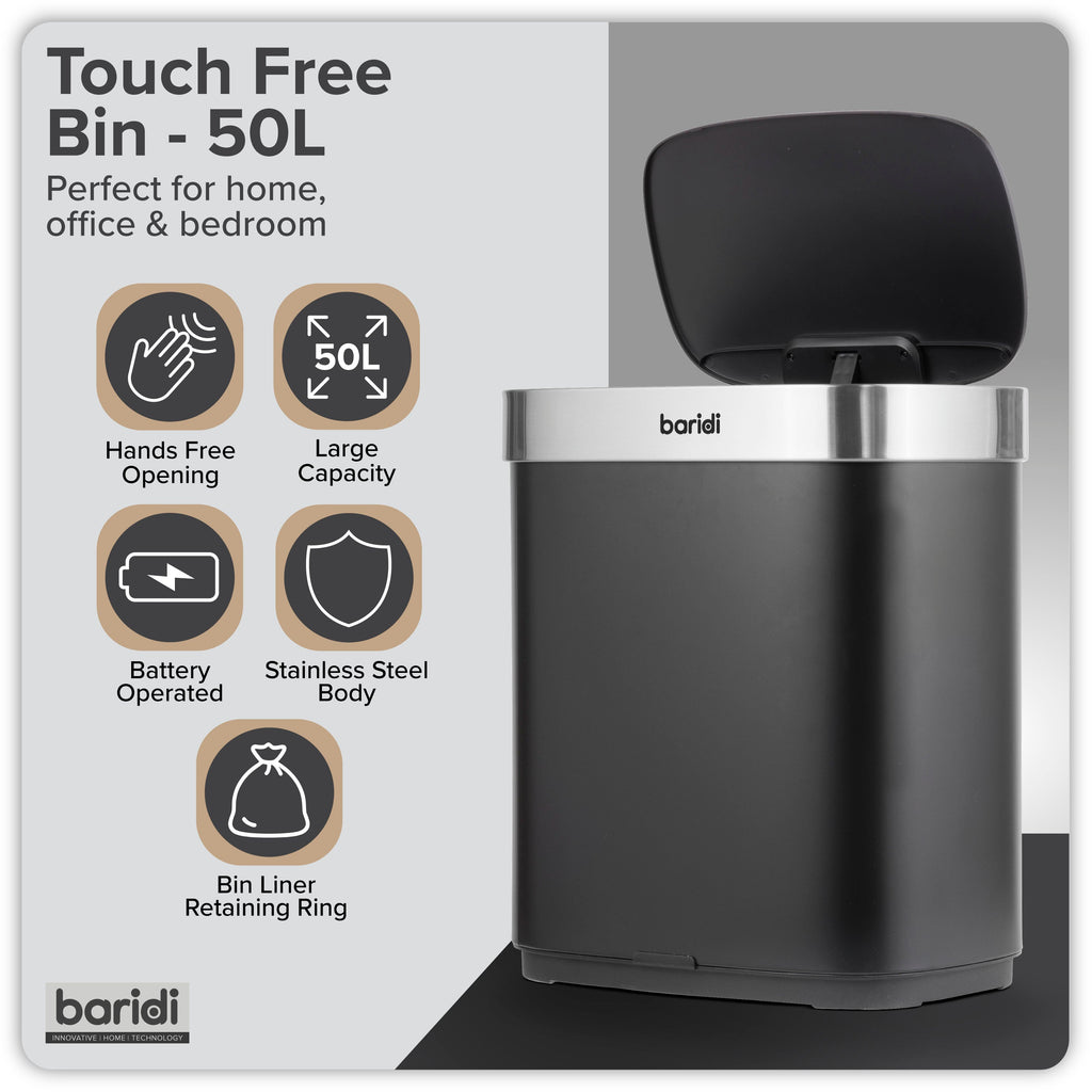 Combining modern convenience with a clean, minimalist design, the 50L Motion Sensor Bin DH281 is ideal for busy homes and office environments. Its infrared sensor automatically opens the lid when movement is detected, providing hygienic, touch-free waste disposal—especially useful when your hands are full or messy. Measuring 44 x 29.8 x 51.5 cm, it offers ample capacity while maintaining a compact footprint that fits neatly against walls or under counters. The bin operates on six AA batteries (not included), eliminating the need for cables and keeping your floorspace uncluttered. A secure ring retainer holds liners firmly in place and out of sight, ensuring a neat, tidy appearance. Crafted from durable materials with a sleek finish, this smart bin combines practicality with contemporary style for everyday ease.