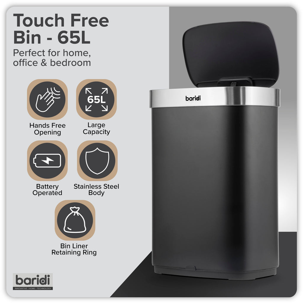Designed for practicality and hygiene, the 65L Motion Sensor Bin DH282 offers generous capacity in a sleek, modern form ideal for family kitchens, offices, and shared spaces. The built-in infrared sensor automatically lifts the lid when it detects movement, allowing for hands-free waste disposal—perfect for maintaining cleanliness while cooking or cleaning. Measuring 44 x 29.8 x 64 cm, it provides ample space for daily waste while keeping a compact, streamlined profile. Powered by six AA batteries (not included), it operates without cables, leaving floors free from clutter. A discreet ring retainer holds bin liners firmly in place and conceals their edges for a neat, polished finish. With its smooth, wipe-clean surface and effortless operation, this smart bin combines convenience, capacity, and style for a tidier, more efficient environment.