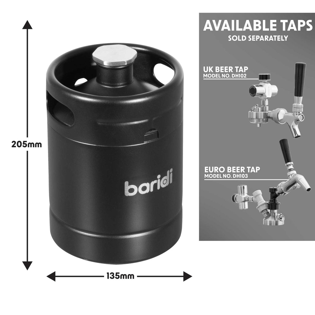 The 2L Growler, crafted from food-grade 304 stainless steel, is a versatile container ideal for both home brewing enthusiasts and those who enjoy store-bought beverages. Its compact size makes it easy to store in your refrigerator, ensuring your drinks are always fresh and ready to enjoy. When paired with the Baridi pressurized faucet, it helps maintain the freshness and flavor of your beverage for a more extended period, making it a perfect companion for your favorite drinks. Designed for use with CO2 cartridges, the Growler works seamlessly with specific Baridi faucet models, including the UK Style Faucet Baridi Model No. DH102 and the Euro Style Faucet Baridi Model No. DH103. With dimensions of 20.5 cm in height and 13.5 cm in both width and length, this Growler is a practical and stylish addition to any kitchen or bar setup, offering convenience and enhanced beverage preservation.