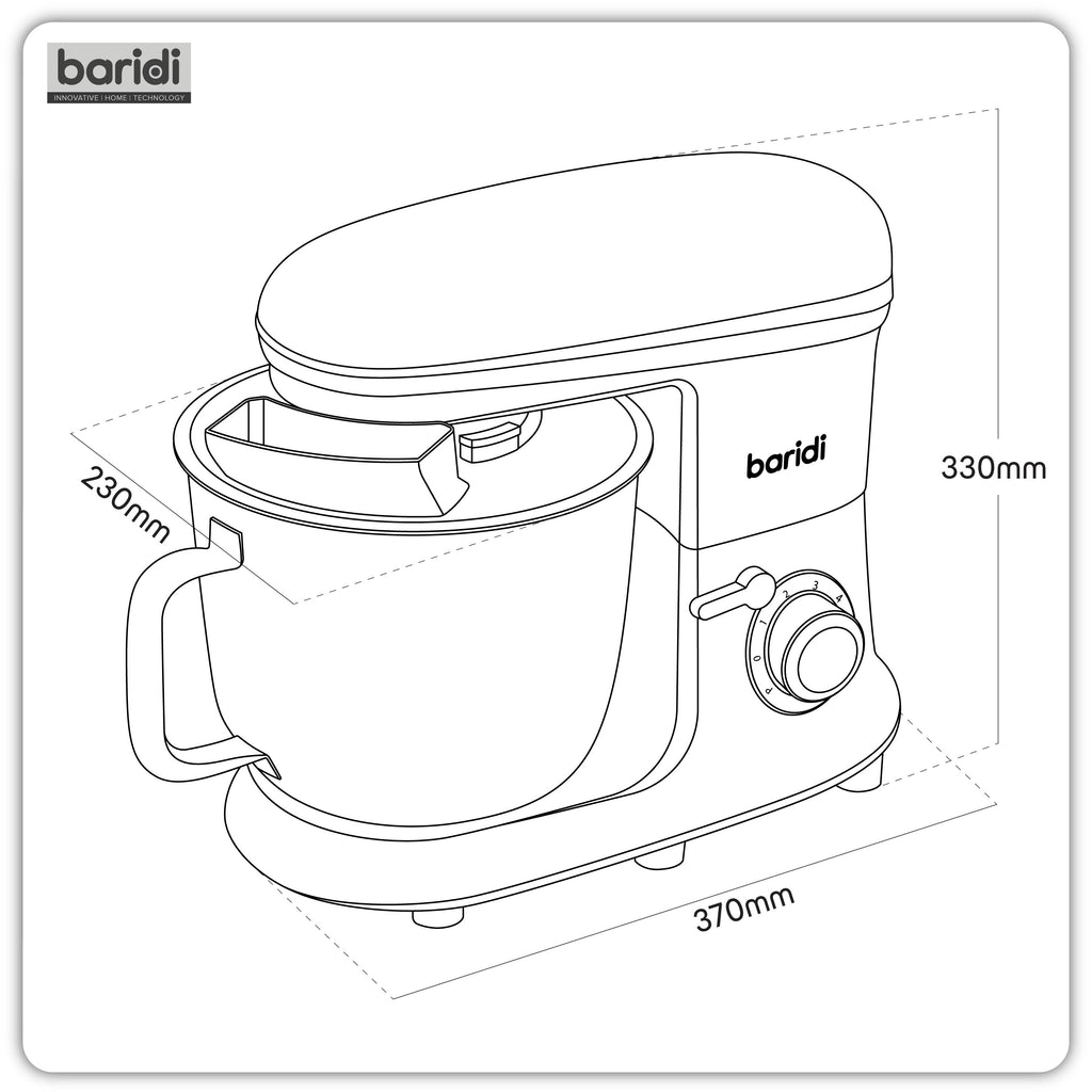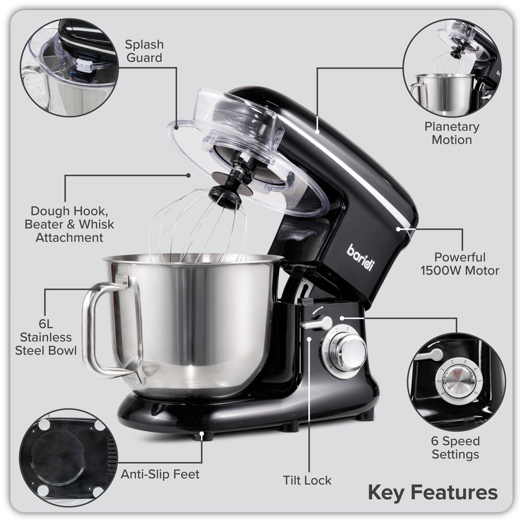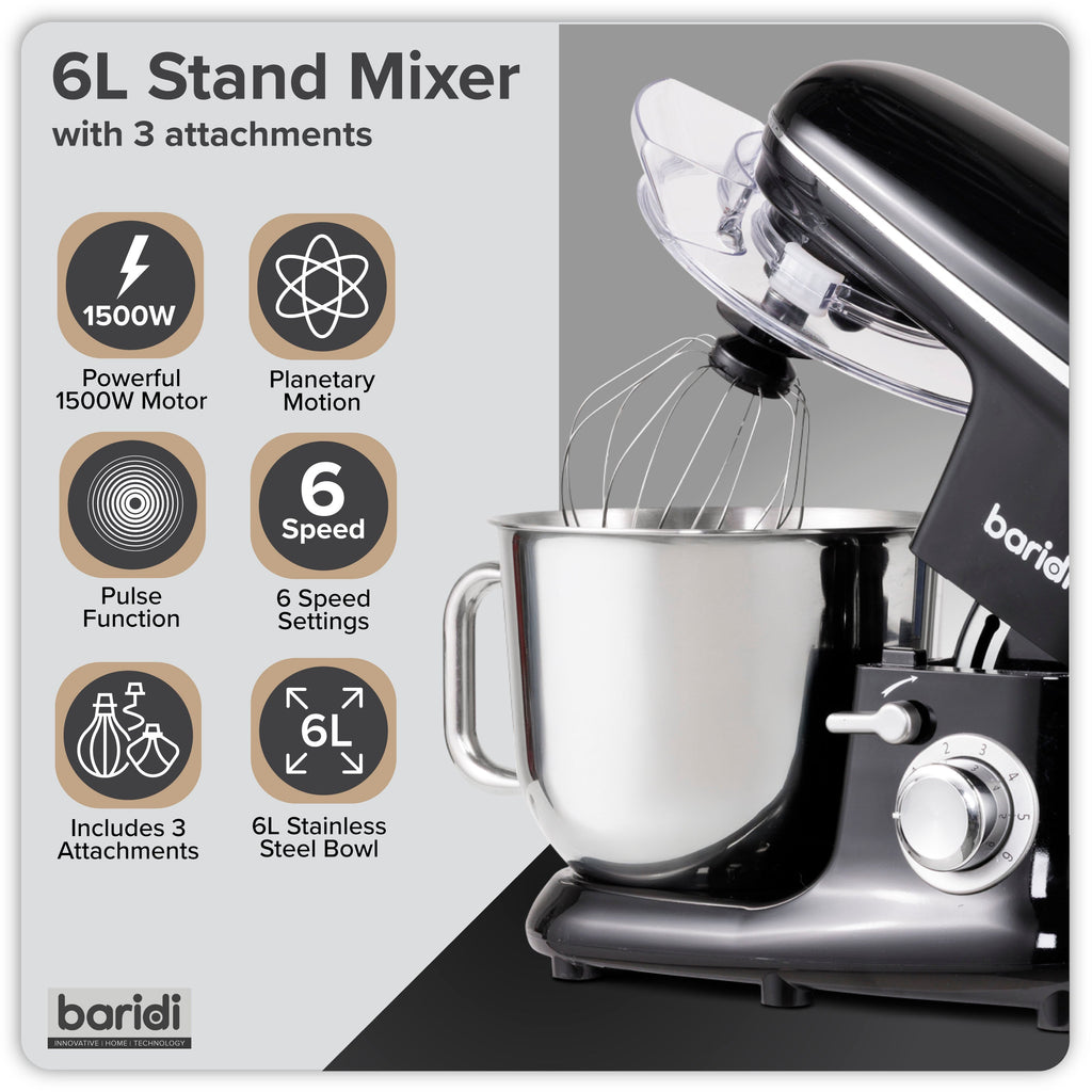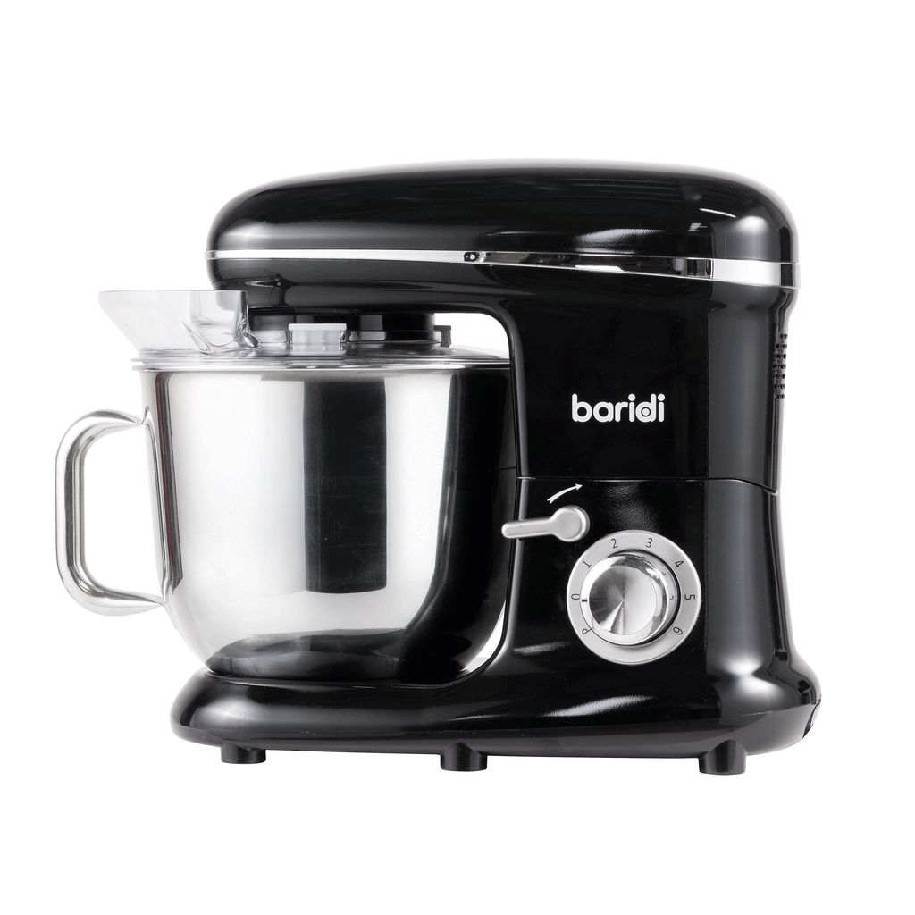 This high-capacity mixer is equipped with a spacious 6-liter stainless steel bowl, ideal for making large batches of dough, cake mix, or other ingredients, catering to both home bakers and bigger gatherings. It comes with versatile accessories including a dough hook, a whisk, and a beater, making it adaptable for a variety of recipes. The powerful 1500W motor delivers strong mixing performance, suitable for heavy doughs and fast whipping, ensuring consistent and reliable results. With 6 speeds and a pulse function, it offers precise control for every task, from gentle stirring to vigorous whisking, plus quick bursts of power. Stability during use is secured with anti-slip feet, preventing any movement even during intense mixing, making this mixer a reliable tool for any kitchen.