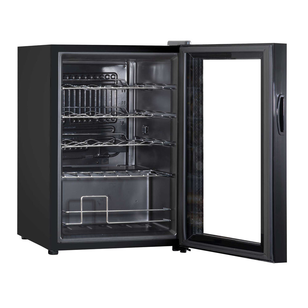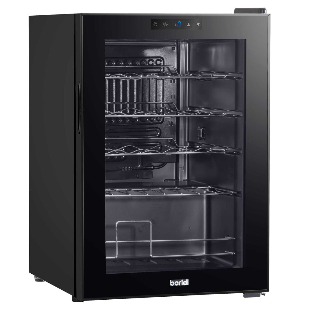 This wine fridge combines style and functionality, making it a great addition to any kitchen. It features a sleek design with an attractive tempered mirror glass door that not only allows you to glance at your wine collection but also helps reflect harmful UV light to protect your bottles. The fridge offers a low temperature range, from 5 to 18°C, easily controlled with touch screen controls. Its compressor cooling technology ensures efficient cooling, while the automatic defrost feature adds convenience. Operating at a quiet 42 decibels, this fridge seamlessly fits under a counter or can sit stylishly on top. With an annual energy consumption of just 142 KWh, it’s energy-efficient too. The fridge's interior is designed for flexibility with removable waved metal shelves that hold up to 20 bottles, accommodating bottles up to 330mm in height. Measuring 430 x 450 x 640mm with a 1.8-meter power cable, this compact fridge fits easily in various spaces. Note that it won’t cool higher than the room's ambient temperature, ensuring your wine is always at the perfect chill without over-freezing.