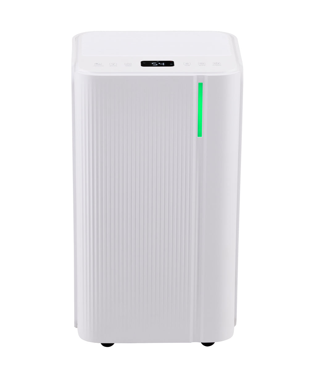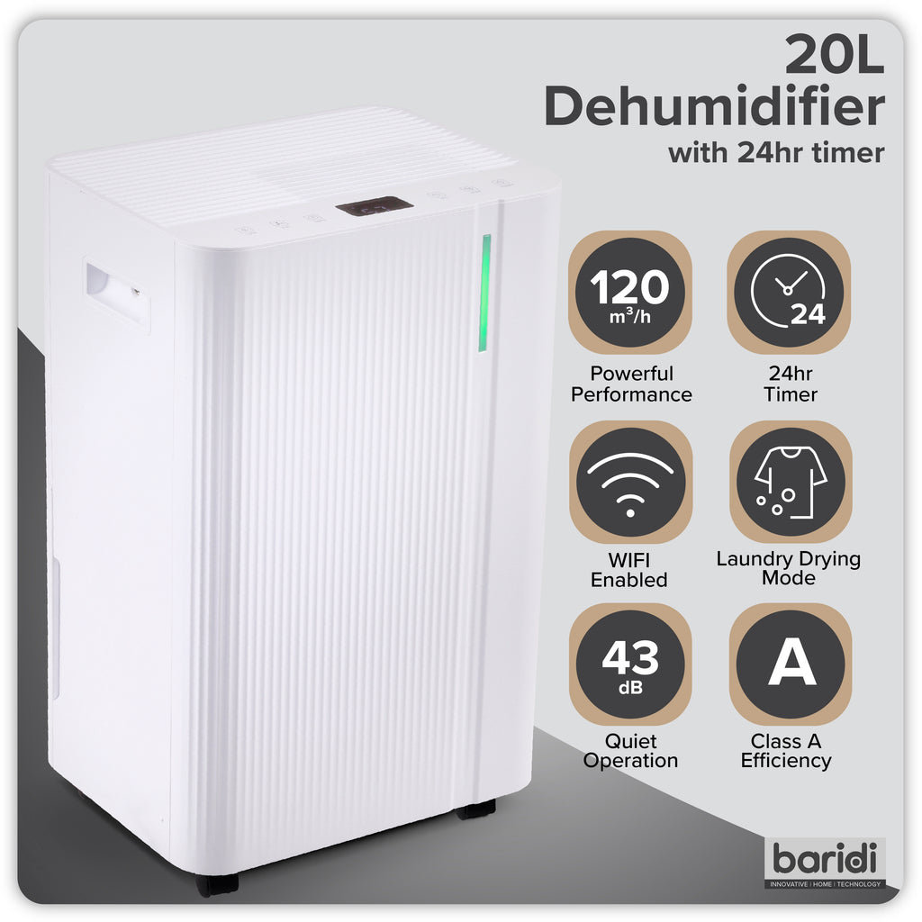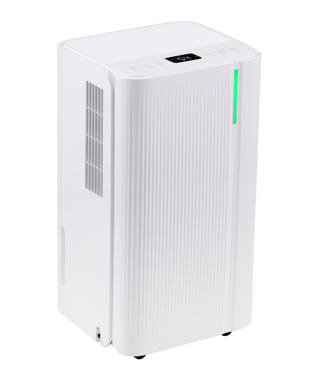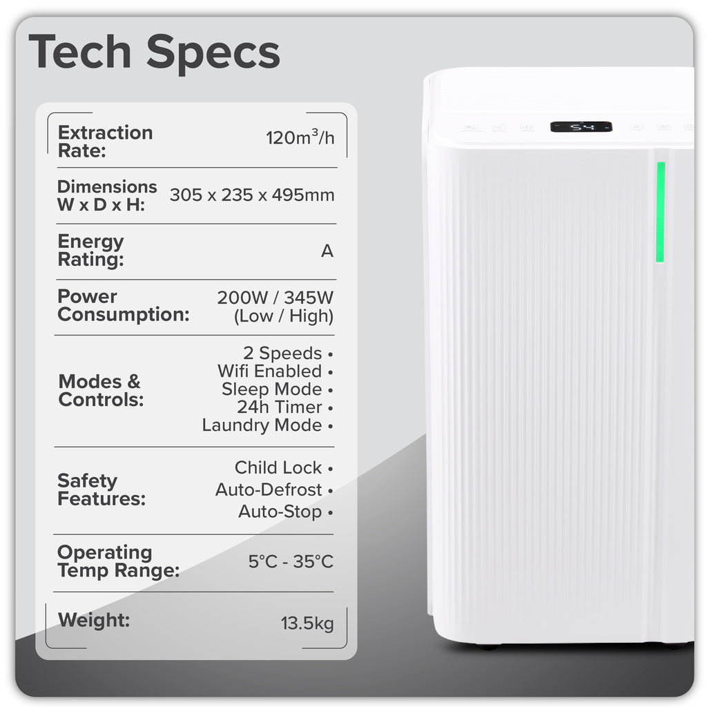 This compact dehumidifier is ideal for smaller rooms of 8–15 m², delivering an impressive 120 m³/h airflow to efficiently remove excess moisture and improve indoor air quality. Its A-class efficiency ensures low running costs, while the whisper-quiet 38 dB operation allows it to function unobtrusively in bedrooms or living areas. A digital colour display and Wi-Fi connectivity via the Tuya or Smartlife apps provide convenient remote monitoring and control. Multiple modes—including Auto, Laundry, and Sleep—offer tailored performance, with Laundry Mode especially useful for accelerating indoor clothes drying. Designed for year-round use, it operates in temperatures from 5 °C to 35 °C and includes a 2 L tank with automatic shut-off, child lock, 24-hour timer, and auto defrost for safety. Measuring 25 × 22 × 44.5 cm and equipped with a side handle and four swivel castors, the unit is easy to move between rooms, combining practical functionality with a discreet, space-saving design.