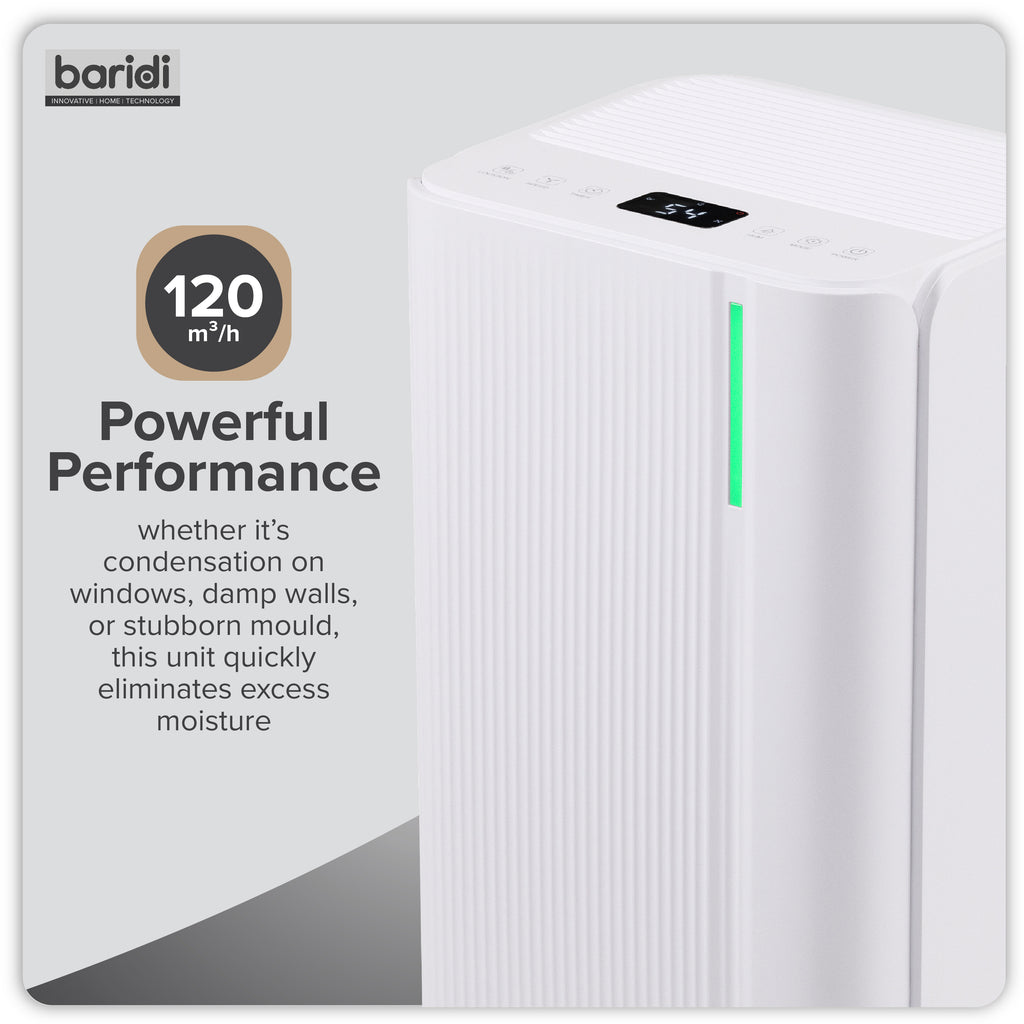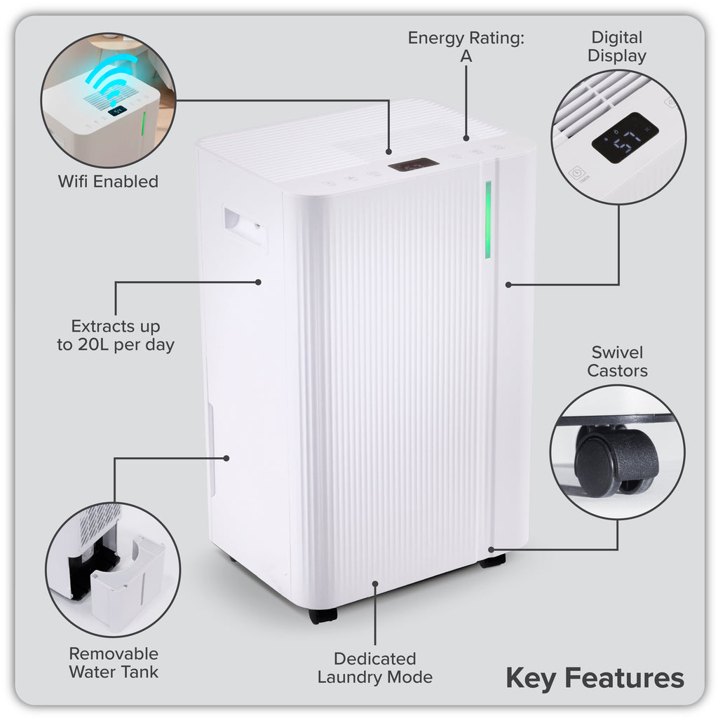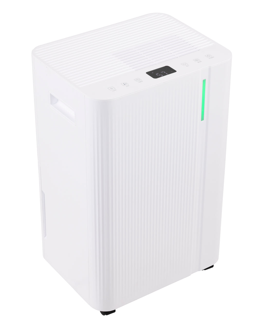 This compact, portable dehumidifier is designed to maintain optimal humidity across multiple rooms, circulating and dehumidifying up to 120 m³/h—sufficient for spaces of 20–30 m². Its A-class efficiency ensures low running costs while the whisper-quiet 43 dB operation allows it to work unobtrusively, whether in a bedroom or living area. Equipped with a digital colour display and Wi-Fi connectivity via the Tuya or Smartlife apps, it offers convenient remote control and monitoring of humidity levels. Multiple modes, including Auto, Laundry, and Sleep, provide flexible operation, with Laundry Mode particularly useful for accelerating indoor clothes drying. The unit is suitable for year-round use, operating in temperatures from 5 °C to 35 °C, and features a 4.5 L tank with automatic shut-off, child lock, 24-hour timer, and auto defrost for safety. Its compact dimensions of 30.5 × 23.5 × 49.5 cm, side handle, and four swivel castors make relocation between rooms effortless, offering practical, reliable climate control wherever it’s needed.